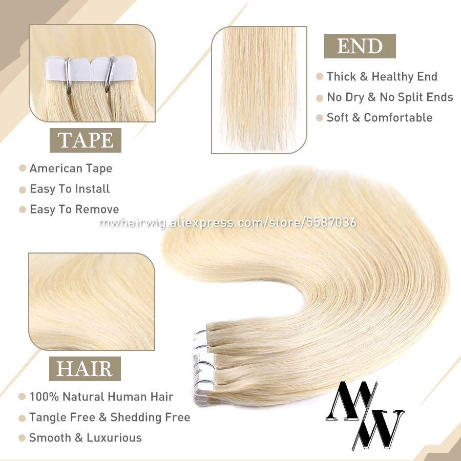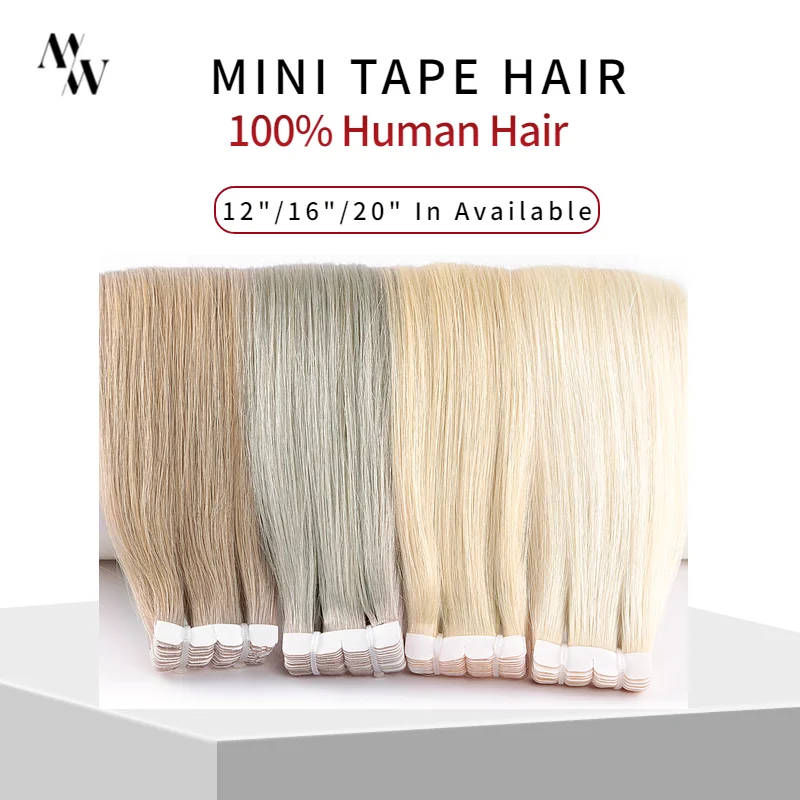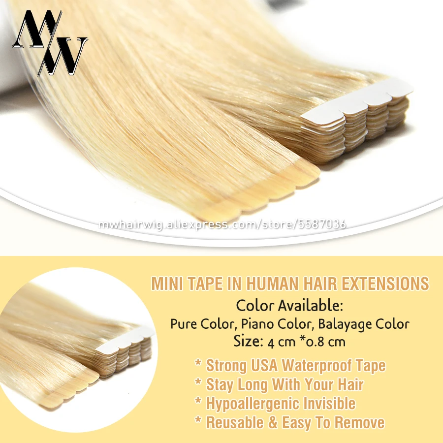 MW мини лента для наращивания человеческих волос, Натуральные Прямые волосы Remy, невидимая кожа, уток, клей на волосы 10 "-24" 20 шт