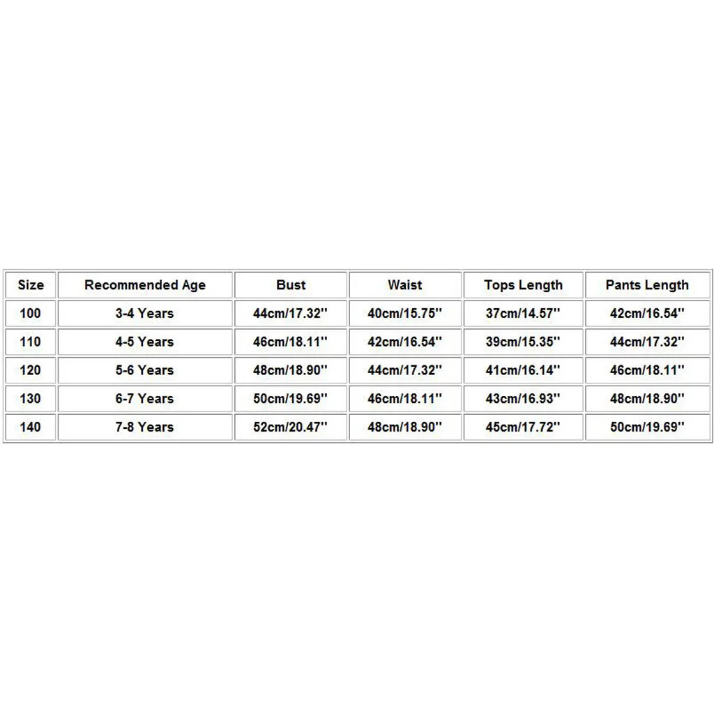 Size Recommended Age Bust Waist Tops Length Pants Length 100 3-4 Years 44cm/17.32'' 40cm/15.75'' 37cm/14.57'' 42cm/16.54'' 110 4-5 Years 46cm/18.11'' 42cm/16.54'' 39cm/15.35'' 44cm/17.32'' 120 5-6 Years 48cm/18.90'' 44cm/17.32'' 41cm/16.14'' 46cm/18.11'' 130 6-7 Years 50cm/19.69'' 46cm/18.11'' 43cm/16.93'' 48cm/18.90'' 140 7-8 Years 52cm/20.47'' 48cm/18.90'' 45cm/17.72'' 50cm/19.69''