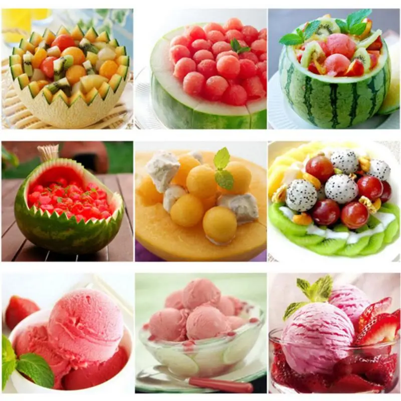 Двухголовый многофункциональный дизайн, можно копать сферические фруктовые шарики или круглые шарики для мороженого, можно легко пилить, а другой-сделать причудливую резку.