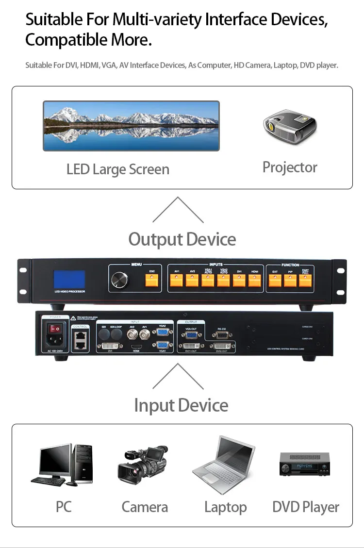 Больше видео вход-светодиодный видеопроцессор 6-ти канальный видео вход, 2 CVBS, 2 VGA, 1DVI, 1 HDMI, в основном закрывает гражданских и промышленных применений. Переключение всех видео входов позволяет быстро резать и выцветать переходы. Практичные интерфейсы видеовыхода-светодиодный видеопроцессор имеет три видеовыхода. 2 видеовыхода с использованием двух выходов DVI, включая выход VGA и выходы DVI, имеют один выходной разъем. После того, как эти три видео запрограммированы, чтобы отправить выход на светодиодный-карту или монитор. В многомашинном соединении очень практично, устраняя использование видео-дистрибьютора, экономя пользователю утомительные соединения, уменьшая скорость сбоя подключения.