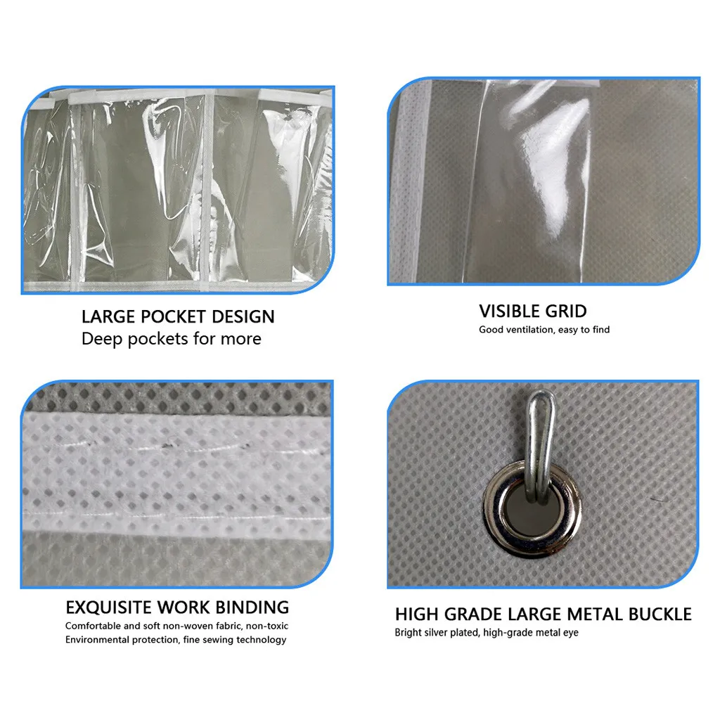 1 упаковка стойки для обуви: 24 вместительных прозрачных кармана 1 упаковка, решение проблемы грязной обуви и освобождения пространства для пола. Прочный материал: прочные карманы из ПВХ могут отлично хранить обувь. Прозрачный органайзер для обуви помогает вам четко видеть предметы и легко их вытащить. Большая емкость для хранения: Каждый карман может держать пару маленьких туфель. Простота в использовании: 4 крепких подвесных крючка позволяют легко повесить органайзер для обуви. Подходит для дверей толщиной менее 1 3/4 дюйма, а толщина верха должна быть не менее 0,064 дюйма. Широкое применение: сохраняет все аккуратным и организованным. Идеально подходит для организации обуви, принадлежностей для уборки, детских игрушек, закусок, аксессуаров для красоты и многого другого в вашей спальне, ванной комнате, кухне, мастерской комнате, прачечной или шкафу.Описание продукта: