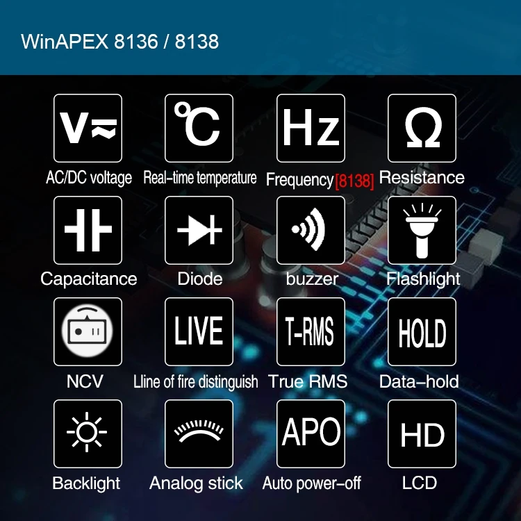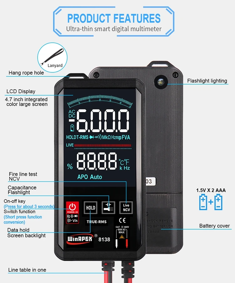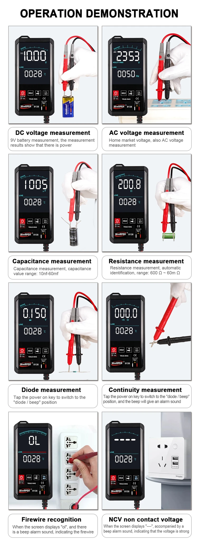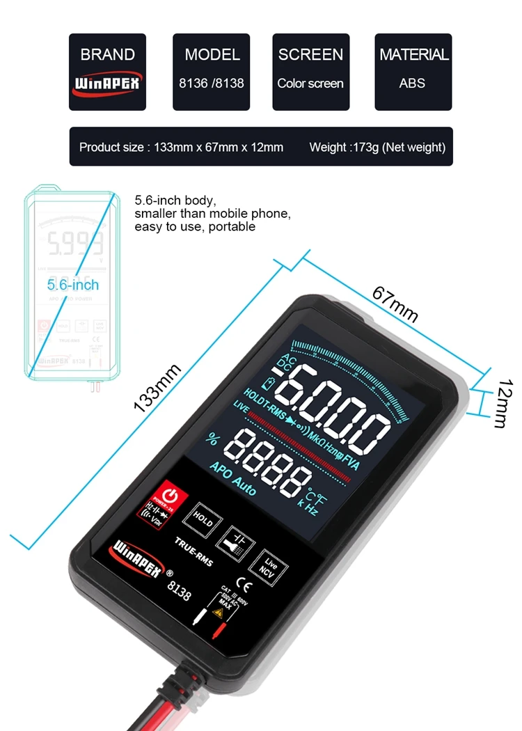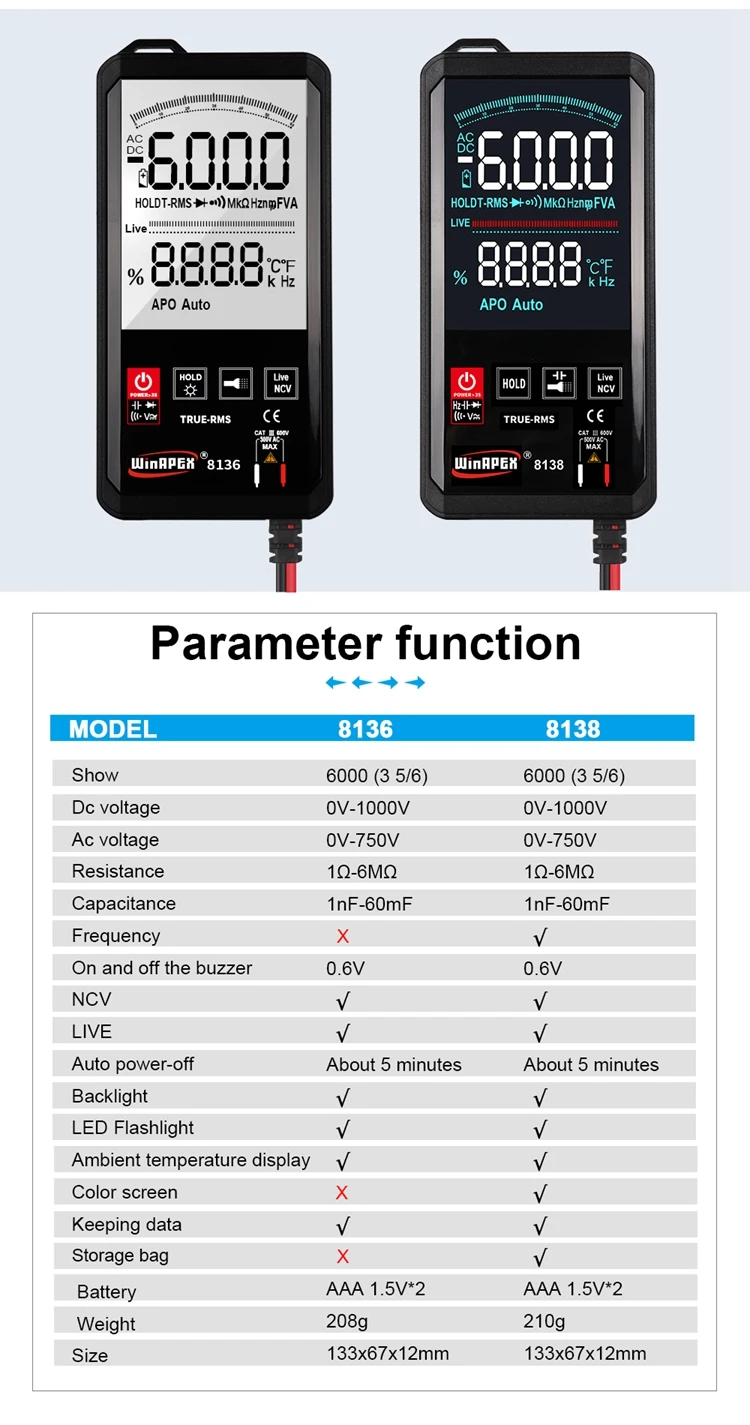 Основной Материал: АБС-пластик Ture-RMS: Да Дисплей: 6000 единиц (3 5/6) Напряжение постоянного тока: 0-1000 в Напряжение переменного тока: 0-750 В Сопротивление: 1Ω-6MΩ Постоянной ёмкости, универсальный конденсатор: 1nF-60mF Бесконтактная проверка напряжения переменного: Да Нулевая линия огня: Да Подсветка: Да Фонарик: Да Дисплей комнатной температуры: Да Хранение данных: Да Дисплей частоты: Да (только 8138) Цвет экрана: Да (только 8138) Включение и выключение теста: 0,6 в Выключение без работы: около 5 минут Мощность: 2 аккумулятора * AAA (не входит в комплект) Размер изделия: 133*67*12 мм/5,2*2,6 * 0.5in Вес товара: 173 г/6,1 унции Примечание: нельзя измерять ток постоянного/переменного тока