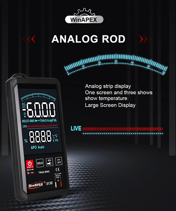 Автоматический диапазон и автоматическая идентификация. Это сравнимый по размерам 4,7-дюймовый мобильный телефон. Ультратонкий дизайн, который легко помещается в кармане. Изысканный дизайн, простой и щедрый, большой сенсорный экран Панель моделирования: Более интуитивно понятное отображение измерений. Аналоговый бар обеспечивает быстрое и точное цифровое представление.