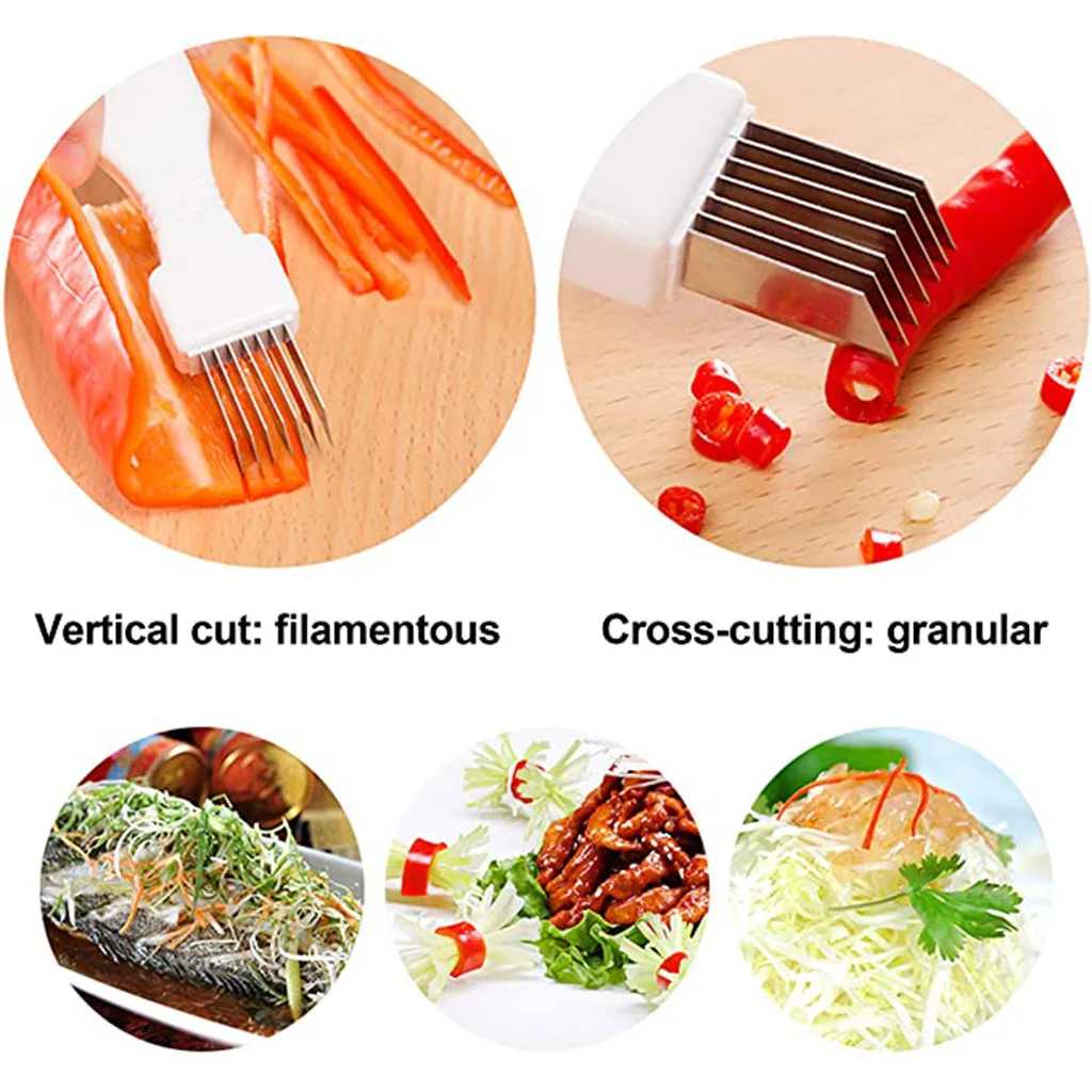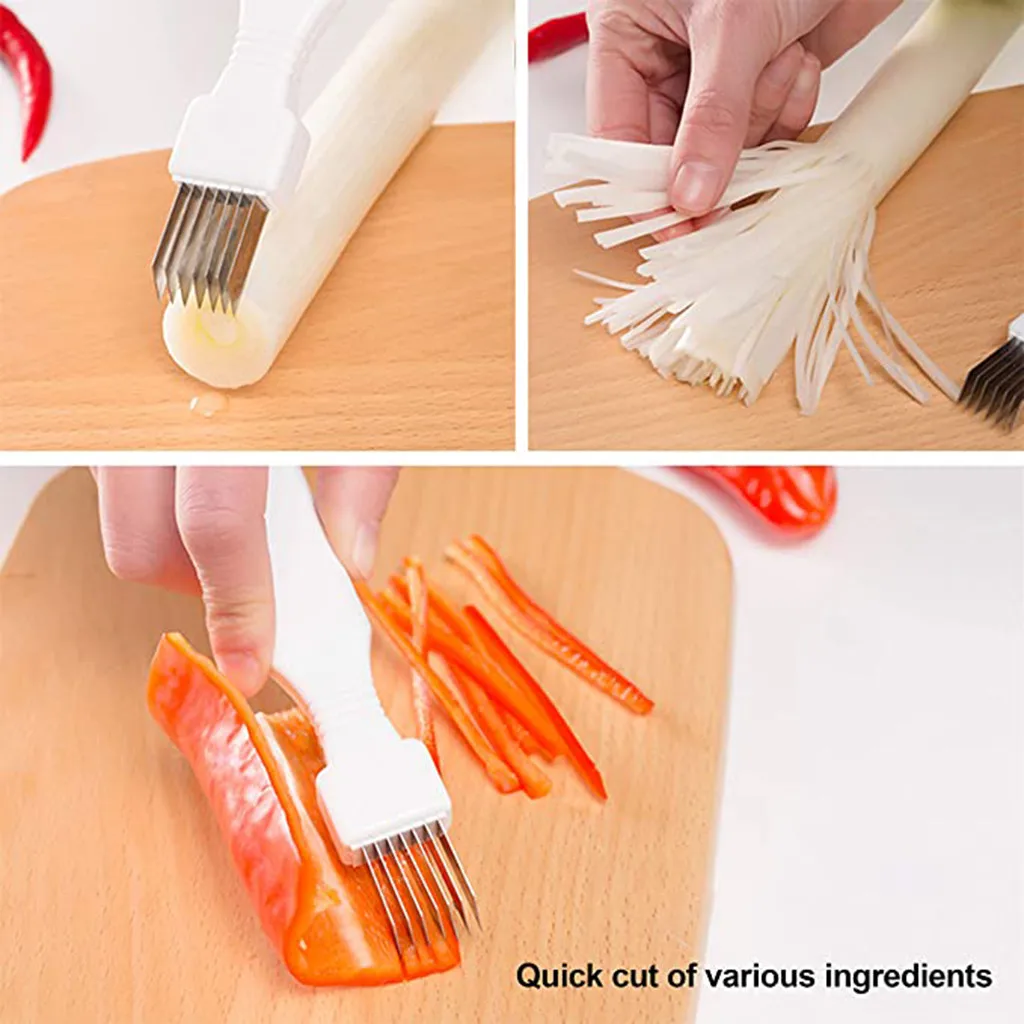 Shred Шелковый нож для овощей Scallions резак для Еды Кухня скоростной измельчитель 4 шт Характеристика: Простота в использовании: Просто поместите овощи на разделочную доску и скользите по резцу вертикально, чтобы получить тонкие полоски Экономия времени: резец имеет несколько лезвий, которые могут разрезать в двух разных направлениях, что позволяет легко протирать весь пучок кристаллов за считанные минуты Высокая эффективность: благодаря острым лезвиям, которые легко скользят по вашей пище для быстрой, чистой и эффективной резки. Универсальный: также полезно для декоративной работы, либо для резки помадки, либо для травления в свернутое тесто для печенья и твердые конфеты Широко используется: идеально нарезающие чесноки, чипсы, кабачки, картофель, имбирь, морковь и т. Д. Как использовать: Поместите овощи на разделочную доску Скольжение резец вертикально на вашем овоще для достижения тонких полосок Поворот овощей после каждого разреза Спецификация: Материал: пластик + нержавеющая сталь Размер: 16,1 × 2,8 см Резка шалота, шалота, овощей и т. Д. Тщательно используйте его и возьмите пластиковую ручку, чтобы разрезать еду. Продукт включает: