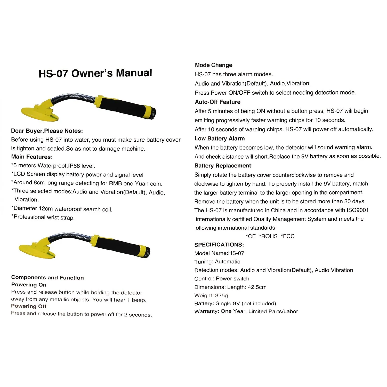 Это водонепроницаемый и качественный металлический прибор для обнаружения и позиционирования с сверхвысокой чувствительностью. Прост в использовании и переноске, вы не будете разочарованы. Особенности: Водонепроницаемость 5 метров, уровень IP68. Жк-экран отображает мощность аккумулятора и уровень сигнала. Около 80 мм дальность обнаружения для юаней одна монета. Три выбранных режима: аудио и вибрация (по умолчанию), аудио, вибрация. Диаметр 120 мм водонепроницаемая поисковая катушка. С профессиональным ремешком на запястье, прост в использовании. Функция автоматического отключения, через 5 минут после включения без нажатия кнопки, HS-07 начнет издавать постепенное быстрое предупреждение в течение 10 секунд. Через 10 секунд после предупреждения HS-07 автоматически отключится. Низкий уровень заряда батареи, когда батарея становится низкой, детектор будет звуковой предупреждающий сигнал. И расстояние проверки будет коротким. Замените аккумулятор 9 в как можно скорее. Технические характеристики: Материал: АБС-пластик Цвет: зеленый (опционально) Батарея: 1*9 В батарея (не входит в комплект) Настройка: Автоматическая Режимы обнаружения: аудио и вибрация (по умолчанию), аудио, вибрация Метод управления: выключатель питания Чувствительность: монета (1 юань): 80 мм/3,1 дюйма Диапазон измерения: 0-250 мм/0-9,8 дюйма Общая длина: 425 мм/16,7 дюйма Вес товара: 316 г/11,1 унции Размер посылка: 460*192*55 мм/18,1*7,6 * 2.2in Посылка вес: 588g / 1.3lb Посылка список: 1 * детектор металла 1 * ремешок на запястье 1 * Руководство пользователя