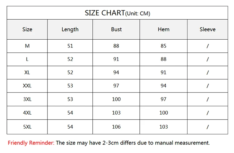 M Обхват груди: 88 см Длина: 51 см L Обхват груди: 91 см Длина: 52 см XL Обхват груди: 94 см длина: 52 см XXL Обхват груди: 97 см Длина: 53 см 3XL Бюст: 100 см Длина: 53 см 4XL Обхват груди: 103 см Длина: 54 см 5XL Обхват груди: 106 см Длина: 54 см