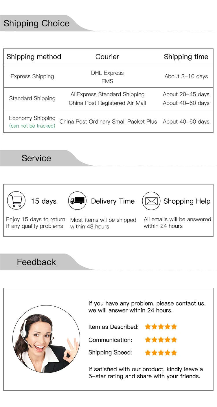 В: материалы изделия безопасны и полезны для здоровья? О: не беспокойтесь об этом. Это самое основное требование. В: Поддерживаете ли вы оптовую и прямую доставку? О: Да, для оптовых продаж мы предложим скидку. Что касается прямой поставки, мы можем отправить товар вашим клиентам напрямую и не будем оставлять информацию о нас, если вы этого хотите. В: Как часто вы обрабатываете заказы? О: Обычно мы отправляем заказы в течение 48 часов, но иногда в праздничные дни мы соответственно задерживаем некоторое время. В: Что я могу сделать, если время защиты покупки истекает? О: если время защиты покупки истекает, свяжитесь с нами, и мы поможем Вам продлить его. Так что ваши деньги не поступят на наш счет.