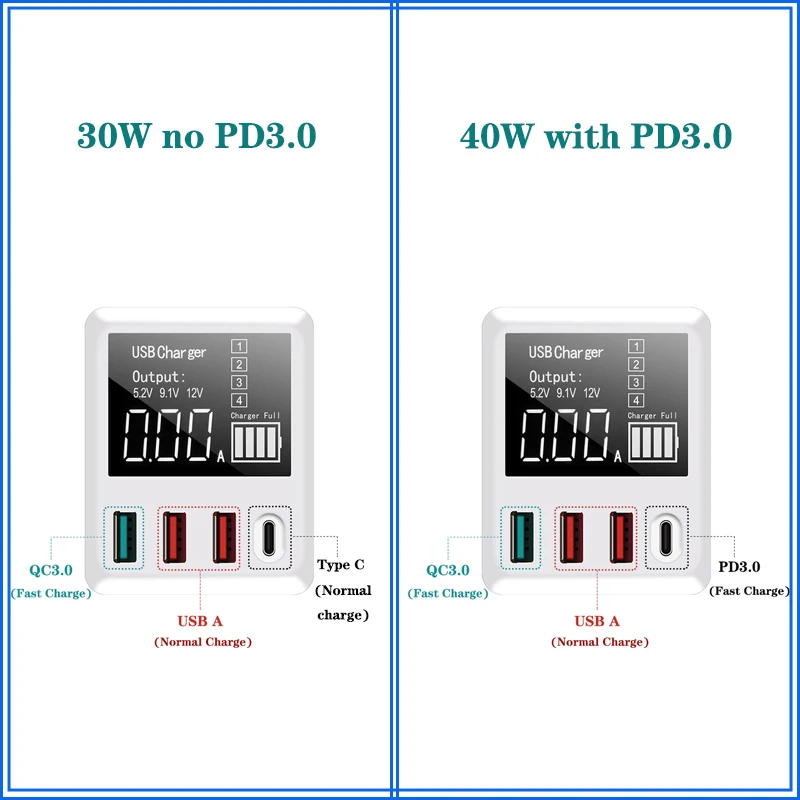 Название продукта: 3USB/QC3.0 интеллектуальное зарядное устройство с дисплеем. ЖК-дисплей: дисплей напряжения и тока. Входное напряжение: 100-240 В переменного тока. Выходной ток: 6А. Выходная мощность: 30 Вт/40 Вт Выходное напряжение QC3.0: 5 В/9 В/12 В. Выходная мощность QC3.0: 3.4A/2.3A/1.5A. Автоматическая идентификация: Автоматическая идентификация напряжения и тока в соответствии с оборудованием. Материал: PC + ABS огнестойкий.