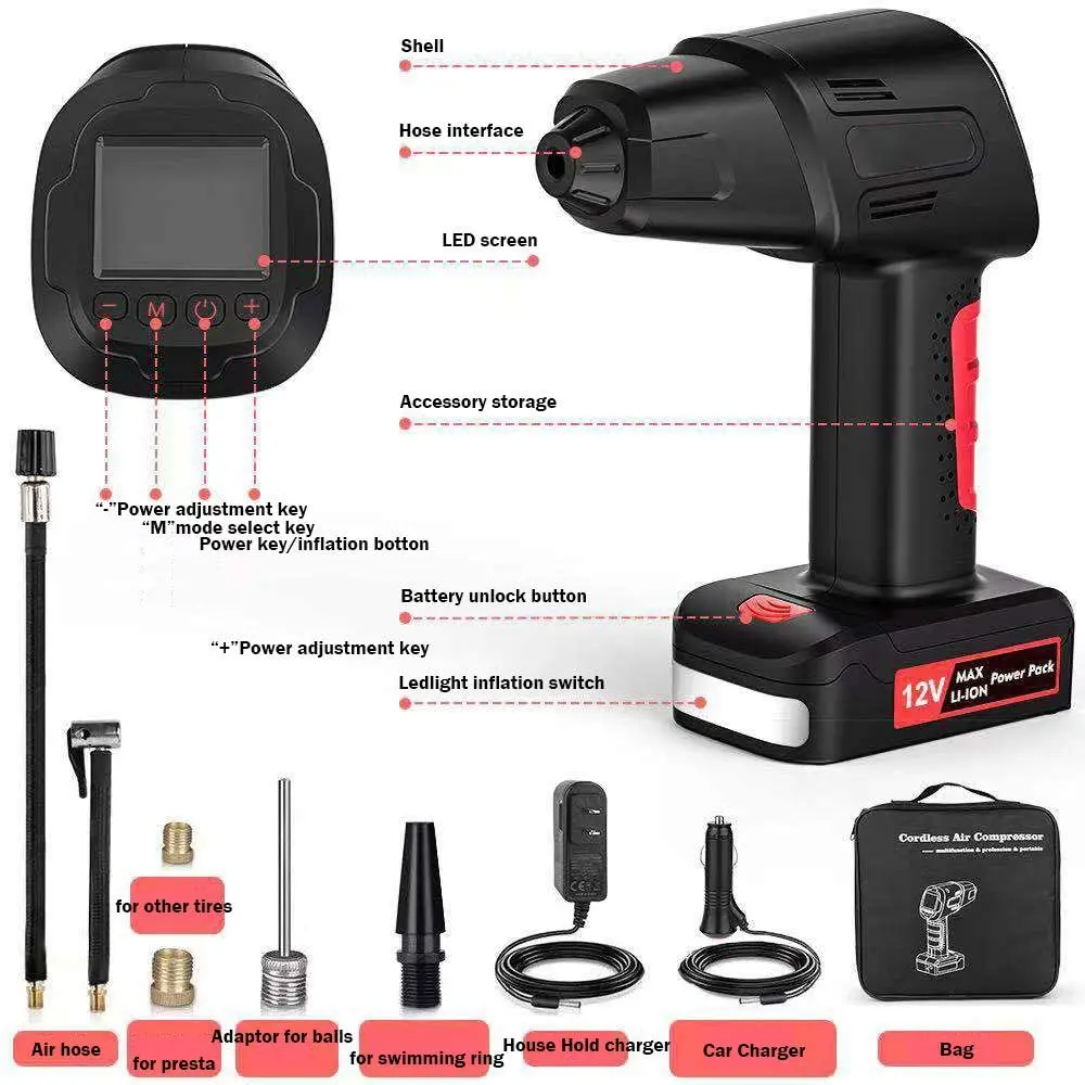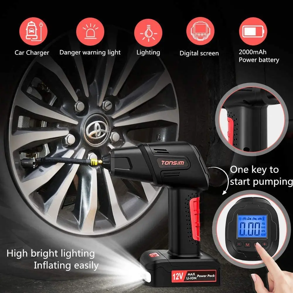 С широким цифровым высокоточным дисплеем в режиме реального времени 40,6 мм * 31,6 мм, с дисплеем питания, вы можете установить давление в шинах до того, что нужно вашим шинам, интеллектуальное определение давления в шинах, аварийное надувание шин автоматически останавливается после полного заполнения