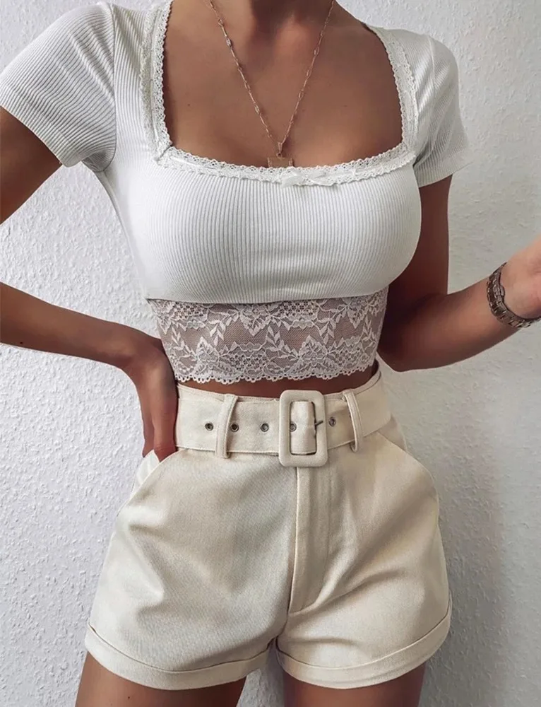 Женский сексуальный трикотажный топ с квадратным вырезом, короткий рукав, однотонный кружевной сетчатый кроп-топ