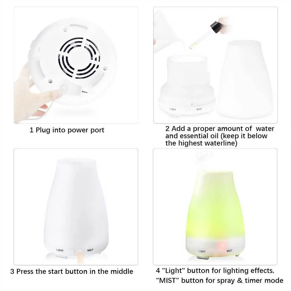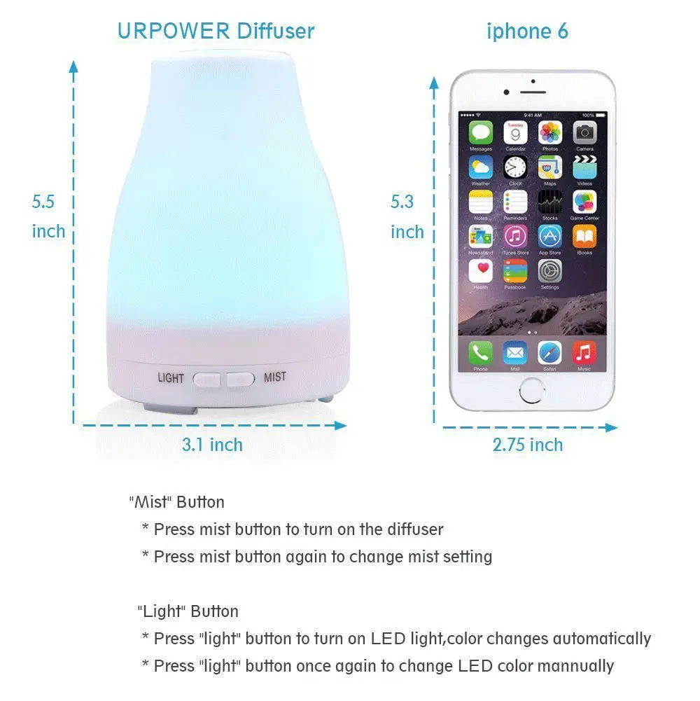 Характеристики: Название продукта: 200 мл увлажнитель воздуха Цвет: белый Материал: АБС-пластик Вилка: ЕС, США, Австралия, Великобритания Рабочая мощность: 11 Вт Резервуар для воды: 200 мл Емкость увлажнения: 35 мл/ч Функции: увлажнение, очиститель воздуха, светодиодный ночник 7 цветов Использование: бытовая техника, офис, спальня, Рабочий стол Посылка включает в себя: 1*200 мл увлажнитель воздуха 1 * вилка (соответствует штепсельной вилке и адаптеру в соответствии с страной получения) 1 * Руководство пользователя Внимание: 1. Пожалуйста, Управляйте машиной в хорошо проветриваемом месте. 2. Пожалуйста, используйте ватный тампон, чтобы регулярно чистить бак. 3. Не сбрасывайте ароматическое масло из тумана или оно будетЗаблокирован. 4. Не добавляйте температуру воды выше 60 °C. 5. Во время заливки или добавления воды никогда не пропускайте воду в воздухВыход и порт питания. 6. Держите машину вдали от детей, людей с ограниченными возможностями и домашних животных. 7. Держите машину вдали от места ниже или она будет сломана: A. Температура выше 40 °C и ниже 0 °C B. Неплоская поверхность или ковер C. Сильный магнитный D. Слишком влажный E. Dusty 8. Пожалуйста, используйте чистое ароматное масло или оно повредит машину.