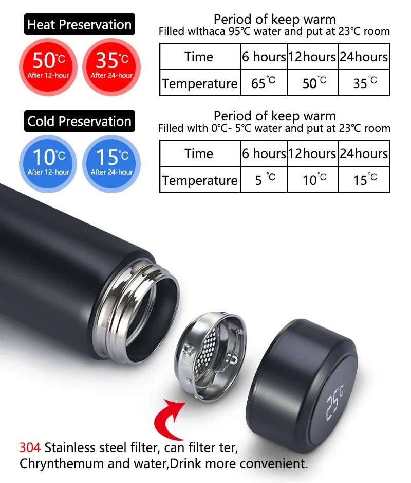 Feature: 1.Fashionable smart LED display with a sense of technology.You can keep touching 80,000 times without changing the battery.That's 5+ years of usage. 2.Intelligent display temperature.Press the top of the thermos softly,Sensitive capacity touch-cover can show the temperature of water inside the thermos immediately.Avoid scalding your lips because of the water temperature is too hot. 3.The thermos is made of 304 stainless steel, which is safe and healthy. Multi-layer design can maintain water temperature for a long time.Holding time is up to 36 hours. 4.Solid color outer paint won't fada away or peel. 5.Using high-quality silicone without BPA to ensure safe drinking. Precise design, excellent air tightness, no water leakage, avoid getting wet clothes when traveling.