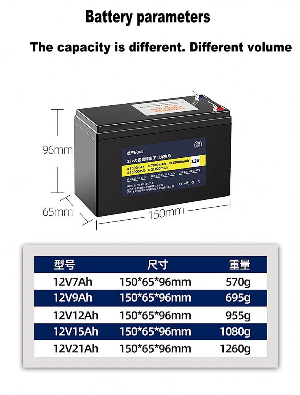 Параметры продукта: Тип батареи: литий-ионный Номинальная мощность: 7 / 9 / 12 / 15 / 21Ah Номинальное напряжение: 11,1 В Размер батареи: 64*98*150 мм Вес батареи: около 500 г-1300 г Срок службы: более 2000 раз, DOD на 80% Вход зарядки Напряжение: 12,6 v Входной ток зарядки: Стандартный 1A, быстрый 5A Ток непрерывной разрядки: 8А, около 100 Вт Температура зарядки: 0 ~ 45 градусов по Цельсию Температура разрядки:-20 ~ 60 градусов по Цельсию Температура хранения:-20 ~ 45 градусов по Цельсию Широкое применение: Электромобиль, электрический велосипед, трехколесный велосипед, скутер, тележка для гольфа, тележка, инвалидная коляска, медицинский инструмент, солнечная система питания, солнечная панель, хранилище энергии, электрические инструменты, электроинструменты, инструменты, светодиодный осветительный прибор, радиоуправляемые игрушки, инвертор, бытовая техника и область устройства, и т. Д. Литиевая батарея имеет встроенную плату BMS, та же батарея может подключаться параллельно, а не серии. Фирменные характеристики батареи: Высокая плотность энергии Длительный срок службы Широкое применение Высокая скорость разряда Безопасность: отличная терпимость к издевательству и экологичность Жизнь: отличный календарь и жизненный цикл. Примечание: У нас есть литиевые, lifepo4 батареи, принимаем Индивидуальные батареи, мы не можем обновить все товары здесь. Если вам нужны другие, пожалуйста, свяжитесь со мной и сообщите мне ваши требования (емкость/напряжение/размер/ток разряда), спасибо.