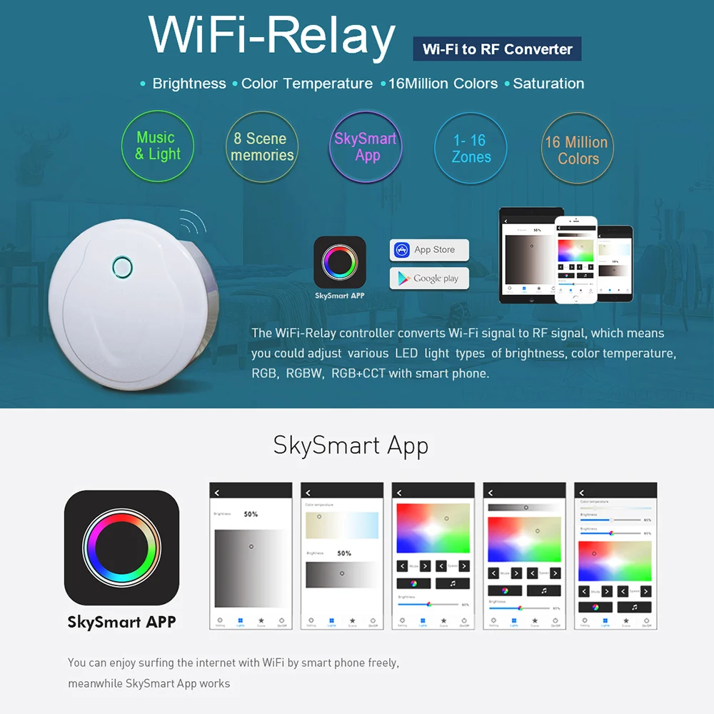 Контроллер WiFi-релейный преобразует сигнал WiFi в радиочастотный сигнал, также известный как шлюз WiFi или концентратор Wifi. Он совместим с несколькими типами приемников Skydance. С WiFi-реле, вы можете контролировать один цвет, двойной цвет, RGB, RGBW, RGB + CCT светодиодные фонари с помощью смартфона.