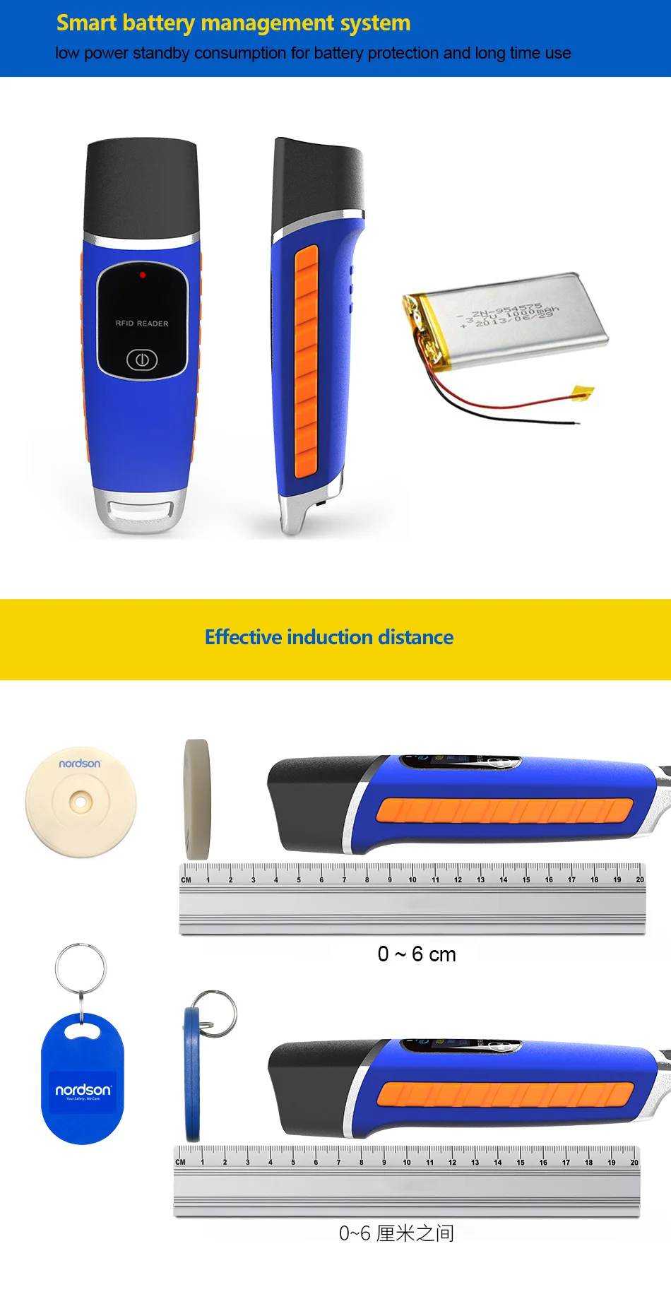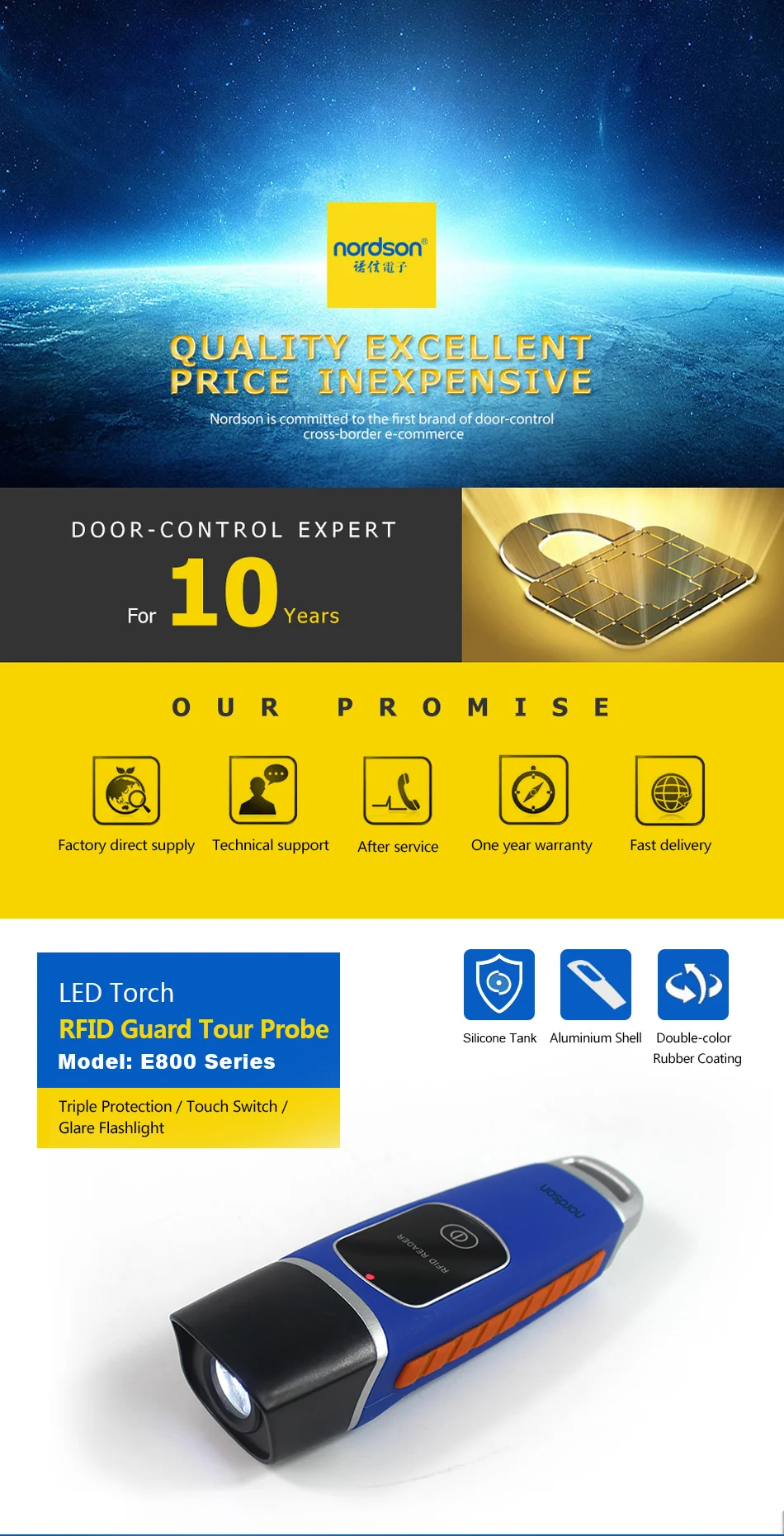 TypeRFID Guard Tour ProbeModelE800/E800LMaterialAluminum alloy shell+Two-color silicone coatingSize145*43*30 mm(L*W*H)Weight130gRecord capacity240000Alarm clock72 groupUSB portMini USBRFID125KhzReading distance0-6cmLightingLED lightLanguageChinese, EnglishBattery managementLower power consumption,auto dormant functionOperation temperature -10℃ ~ 60℃Operation humidity20%~80%Reading speed≤1.0sE800NO SCREENE800LDigital display screenWorking voltage3.3VWhy choose NORDSON?