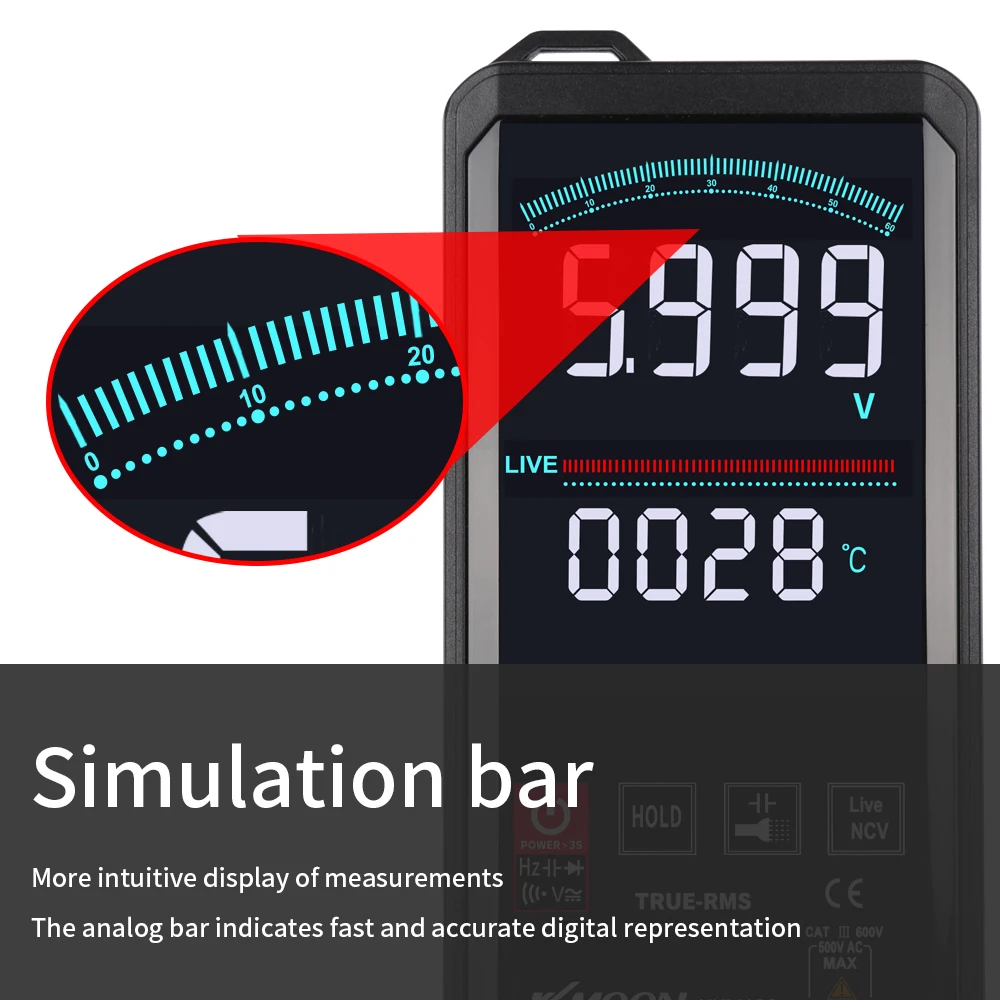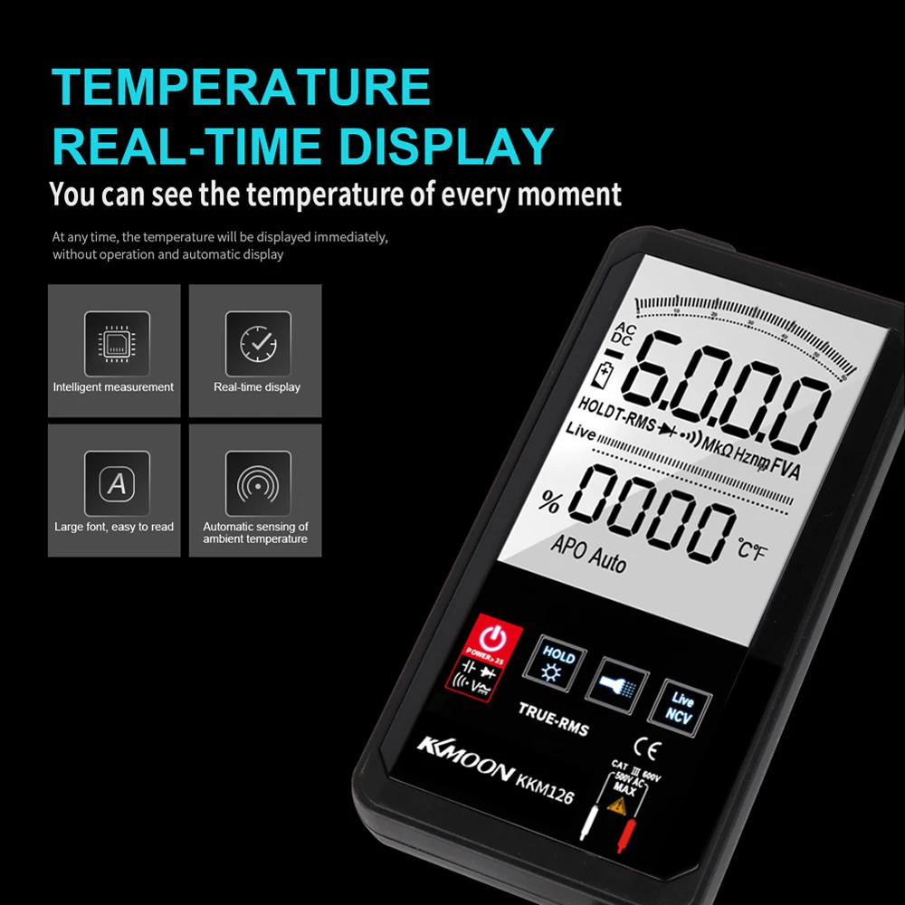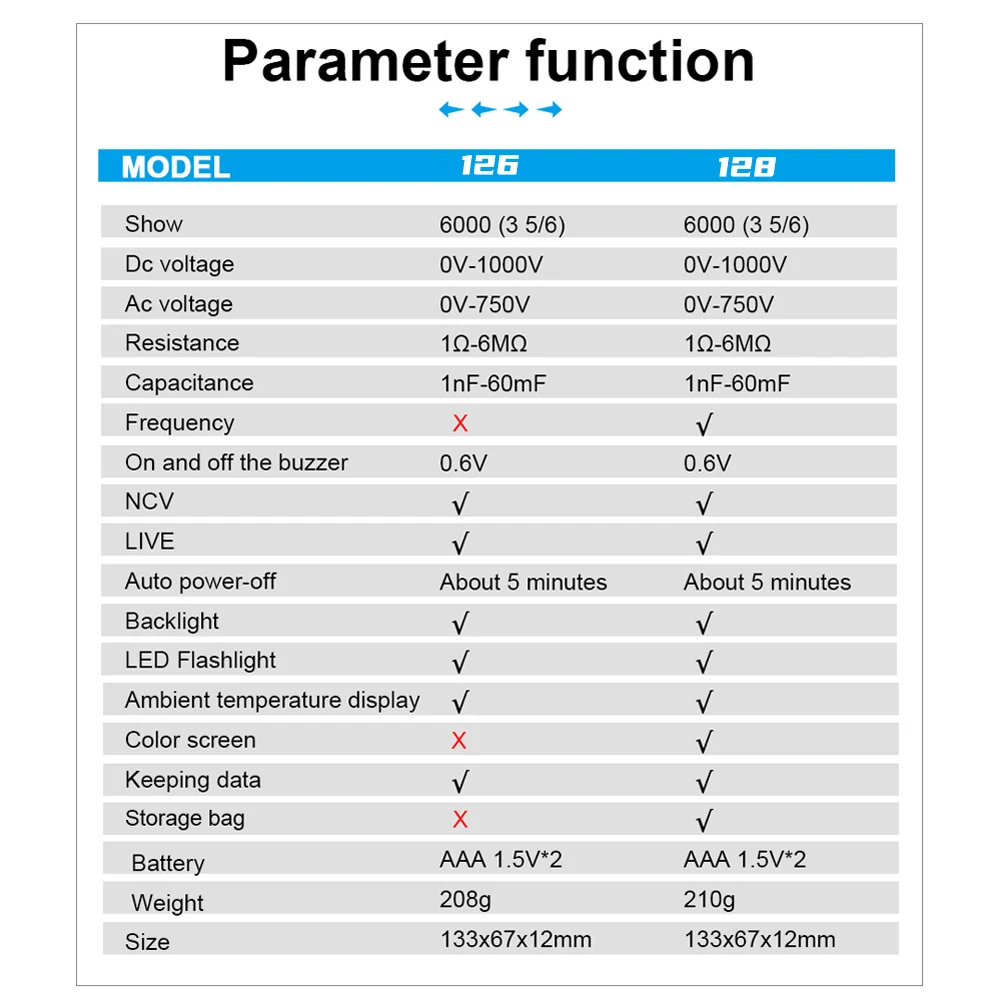 Функция: тест на напряжение, Частотный тест, тест на емкость, тест на сопротивление, диодный тест, распознавание пожарного провода, фонарик, электрическое поле, звуковой сигнал, истинный RMS, автоматическое отключение, хранение данных.