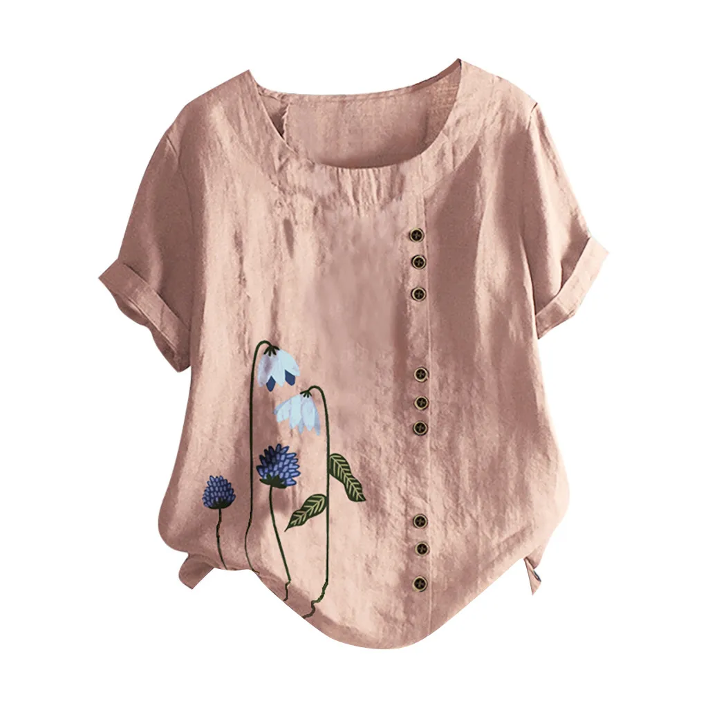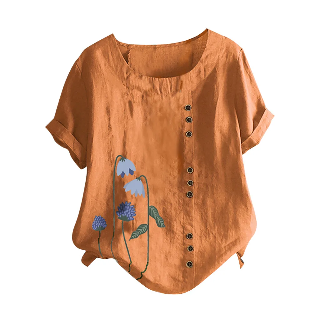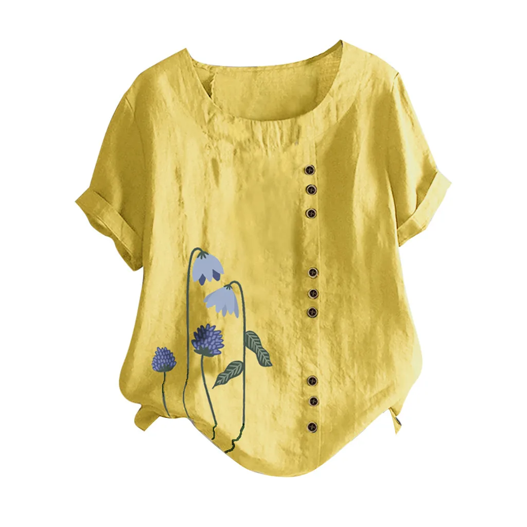 Женские винтажные топы из хлопка и льна с круглым вырезом и короткими рукавами и принтом на пуговицах размера плюс