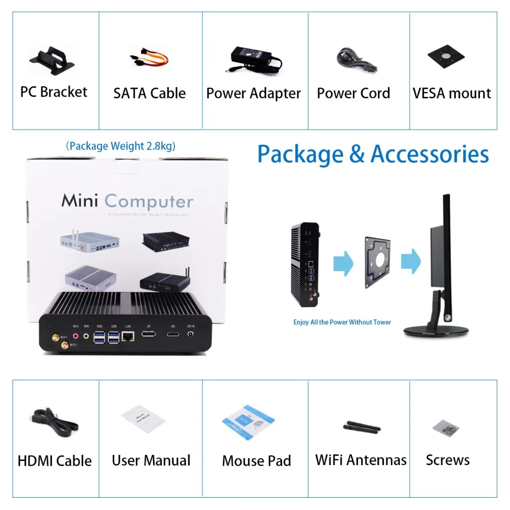 1 * Мини ПК; 1 * Адаптер питания; 2 * антенны