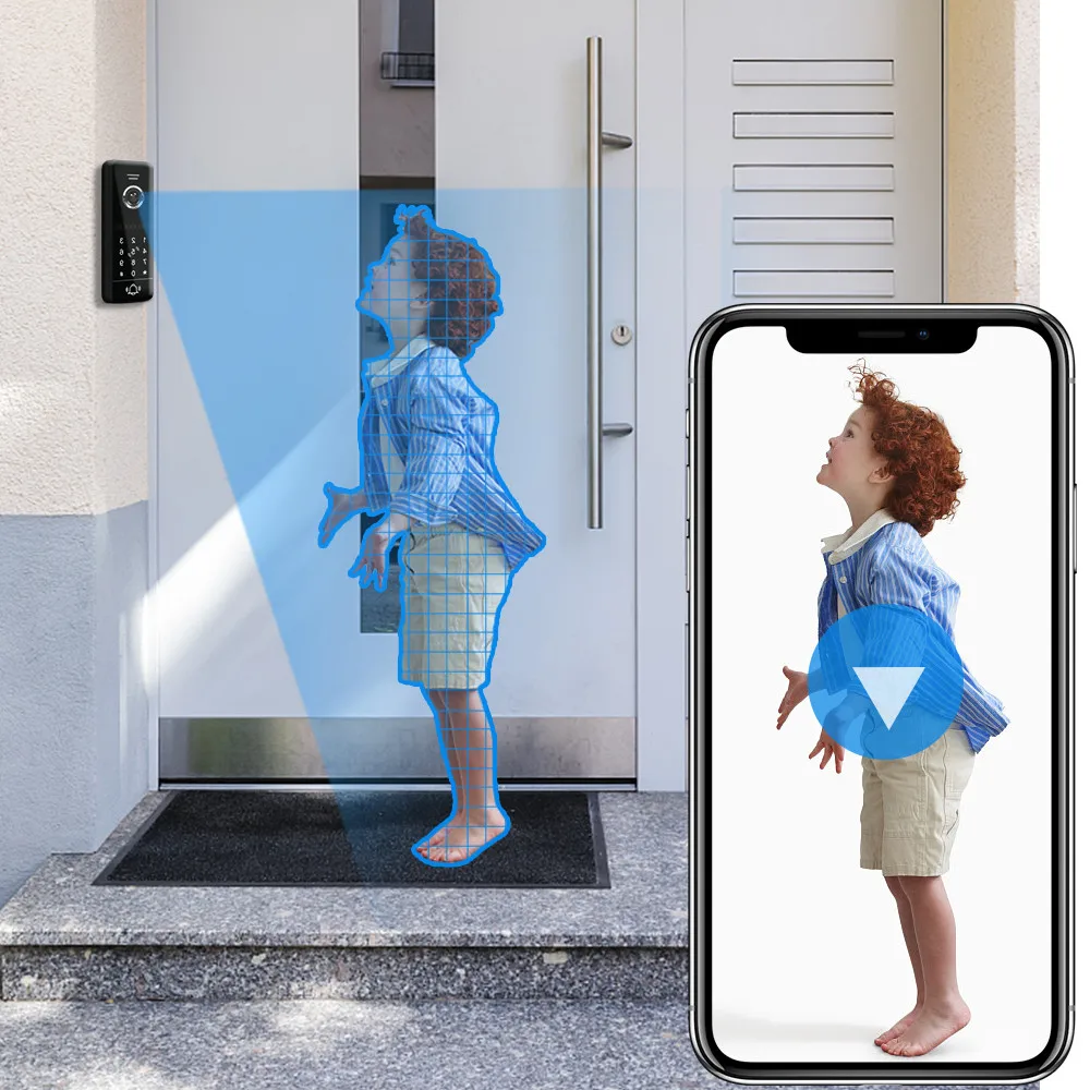 С помощью новейших технологий, когда пользователь нажимает на дверной звонок, ваш телефон получит уведомление о приложении, вы можете видеть, слушать и говорить с любым у вашей двери, даже Удаленная разблокировка через ваш смартфон везде, независимо от того, где вы находитесь, вы можете удаленно получить доступ к камере, чтобы увидеть прямую трансляцию и оставаться на связи