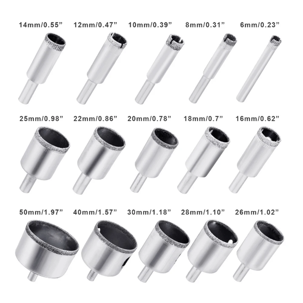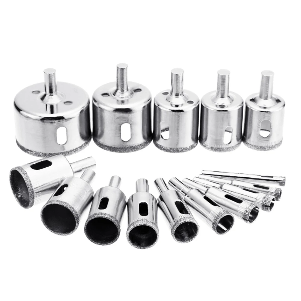 15 шт. кольцевых пил, различных размеров, используются для сверления отверстий для стекла, керамики, мрамора, плитки и гранита.
