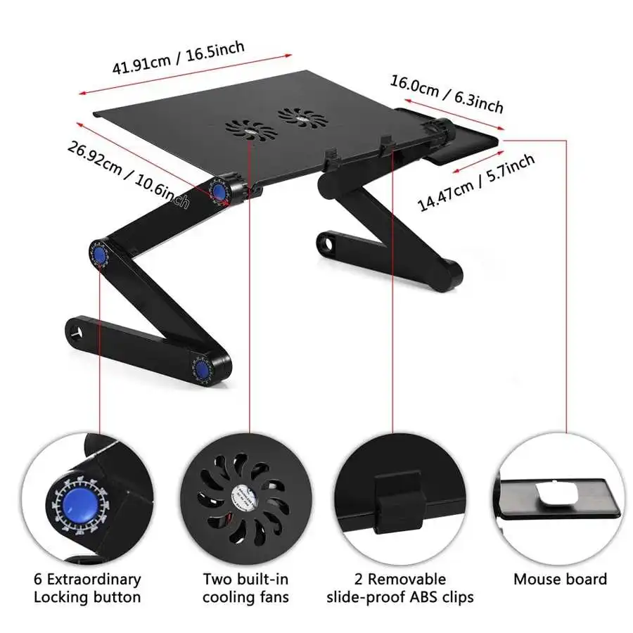 Этот ноутбук из алюминиевого сплава разработан, чтобы помочь создать идеальные рабочие позиции, чтобы способствовать выравниванию позвоночника и хорошей осанке, является ультра-прочным, прочным и прочным. И складной стол для ноутбука можно регулировать различные углы, высоту и наклон комбинаций, так что многофункциональный стол для ноутбука может быть использован как ТВ обеденный лоток, звуковое оборудование стол, проектор стол, стоячий стол платформы, стоячий стол, стол с подставкой, лоток для книг, письменный стол и держатель для планшета.
