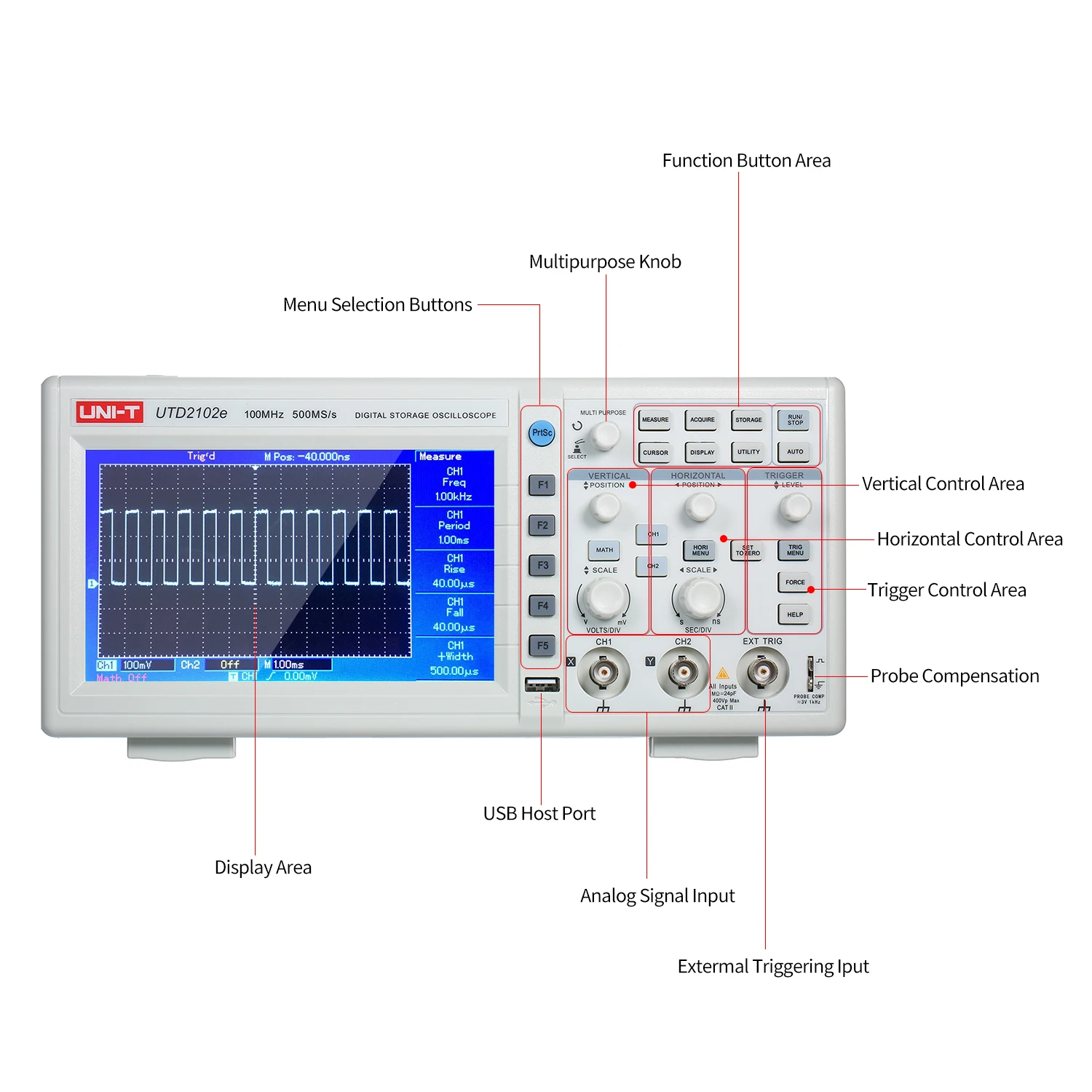 UNI-T UTD2102e цифровой осциллограф с большим 7 "дисплеем и 100 МГц полоса пропускания, 32K длина записи для 2 канала с самой высокой 500 мс/с частота дискретизации. Это широко используемый электронный измерительный инструмент, может трансформировать невидимые электрические сигналы в видимые изображения, чтобы люди могли изучать изменения различных электрических явлений.