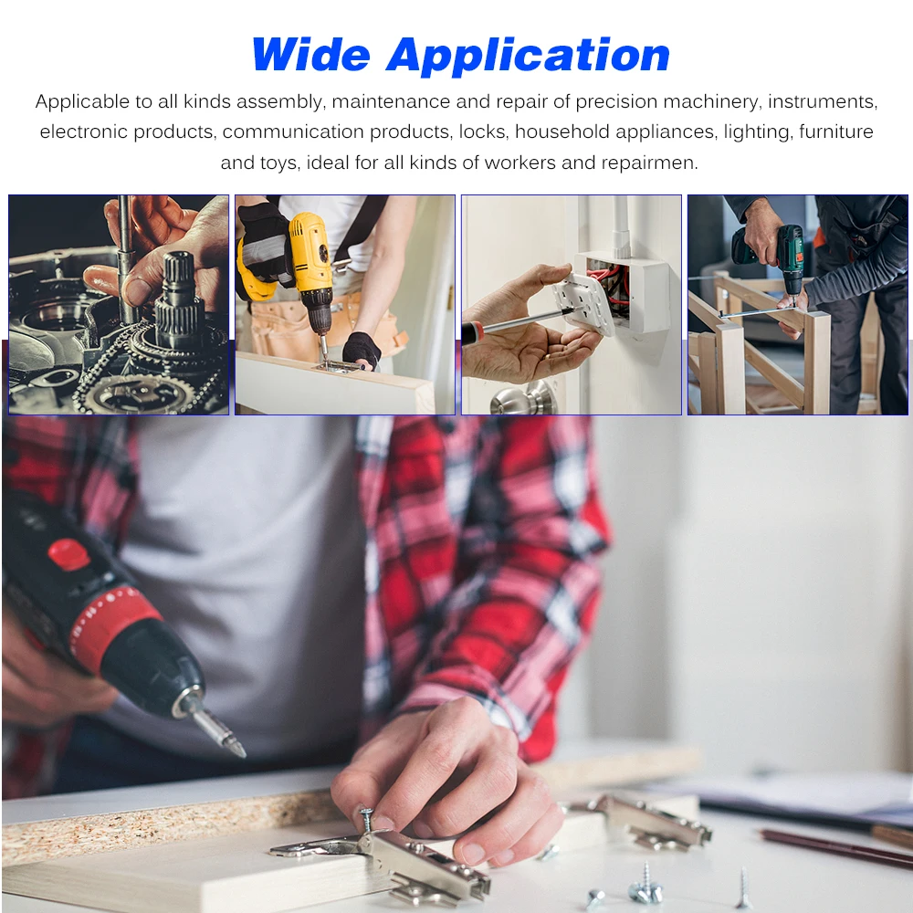 -Широкое Применение: подходит для всех видов сборки, обслуживания и ремонта точного оборудования, инструментов, электронных продуктов, средств связи, замков, бытовой техники, освещения, мебели и игрушек, идеально подходит для всех видов работников и ремонтников.