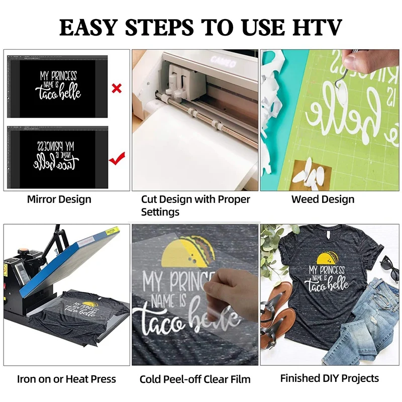 E. Виниловые рулоны HTV подходят для машин с изображением силуэта и крикутов. Глажка шифера с винилом для изучения воздуха 2 и 1.