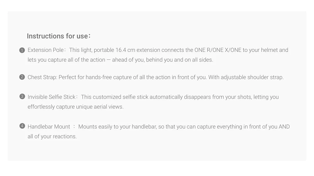 Комплект с невидимой палкой для селфи включает в себя невидимую палку для селфи, плоское клейкое крепление для шлема (включая удлинитель), нагрудный ремень и крепление на руль