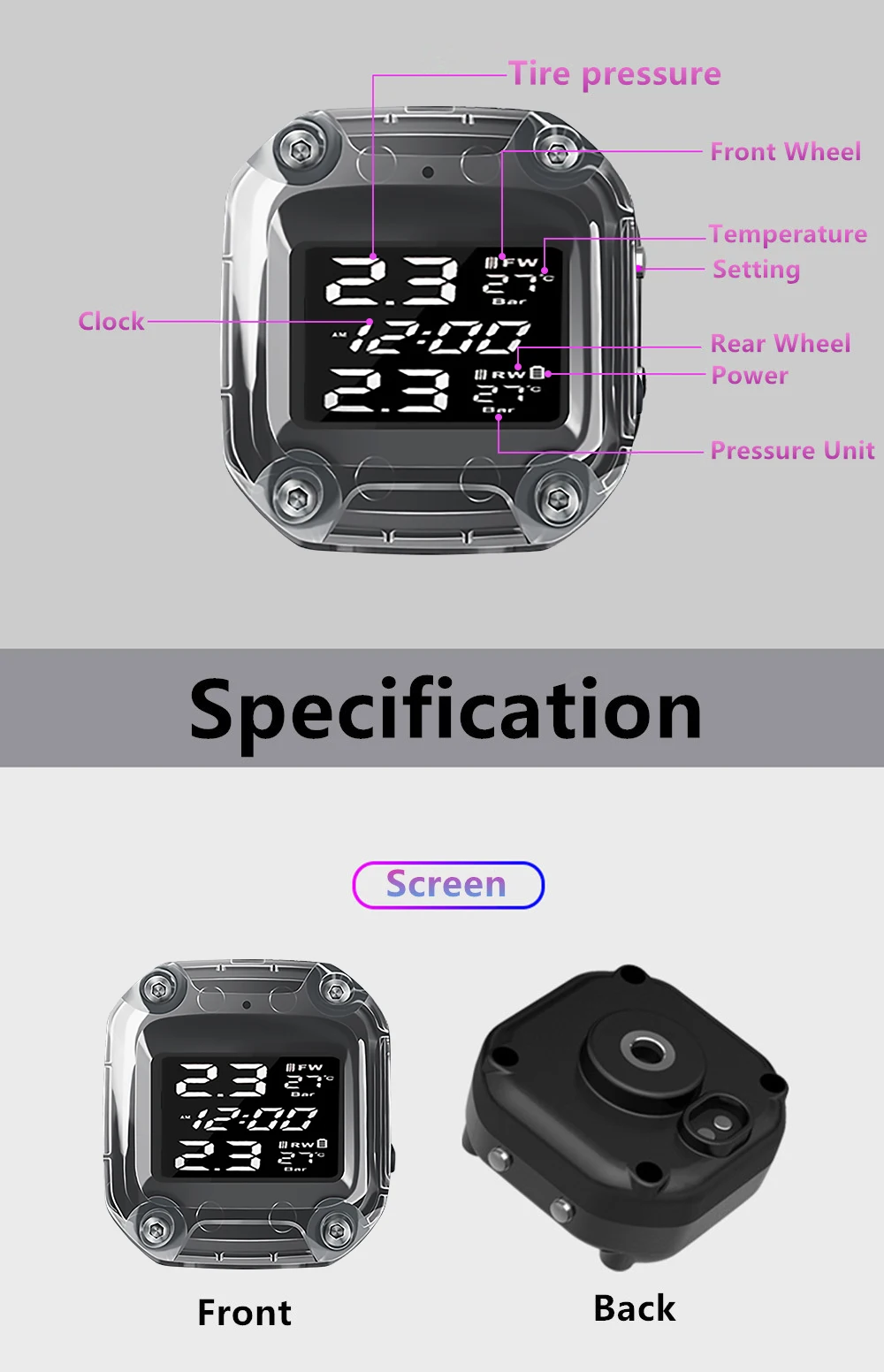 Рабочая температура датчика: -30 ℃ -80 ℃ Диапазон контроля давления датчика: 0-8 бар (116Psi) Точность датчика давления: ± 0,1 бар (1,5 psi) Точность датчика: ± 3 ℃ Мощность передачи датчика: <10dBm Частота передачи датчика: 433,92 МГц