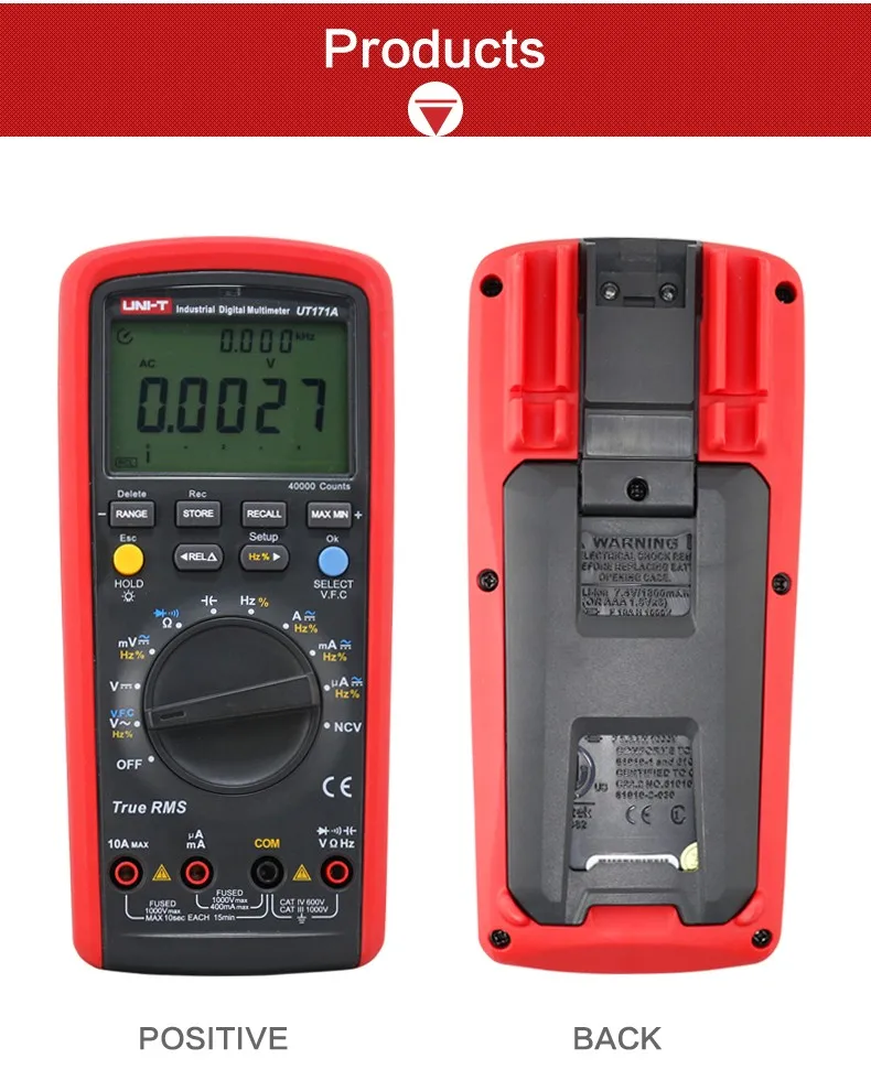 Серия UT171-это промышленные мультиметры, используемые профессионалами. Его встроенный выход квадратной волны полезен для устранения неисправностей промышленных сигналов управления. Функция LoZ (ACV) может использоваться для определения остаточного (Призрачного) напряжения в больших конденсаторах. OLED-дисплей ut171cидеально подходит для работы при низких температурах до-30 °C.