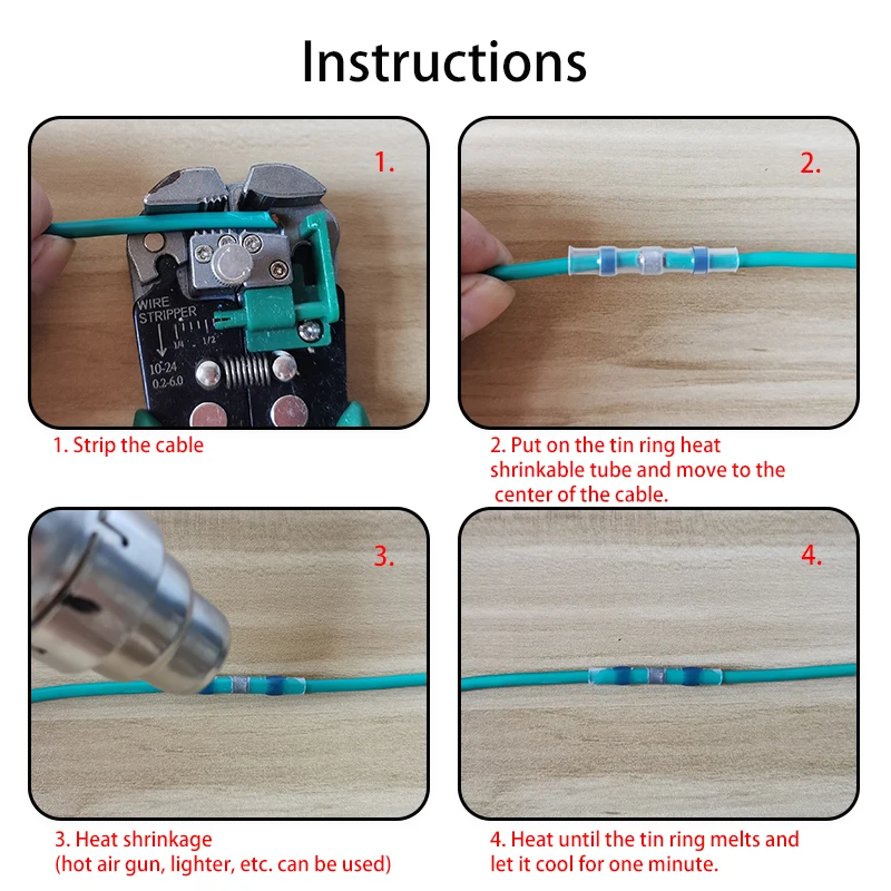 1. Отрежьте оба конца кабеля для ремонта. 2. Поместите изделие в пункт ремонта кабеля и зафиксируйте его. 3. Вы можете использовать пистолет горячего воздуха или зажигалку для расплавления водонепроницаемого клея и припоя на обоих концах продукта. 4. Так как требуется время, чтобы остыть сразу после нагрева, он может быть использован после охлаждения и очень прочный. 5. Смотрите полное видео ниже.