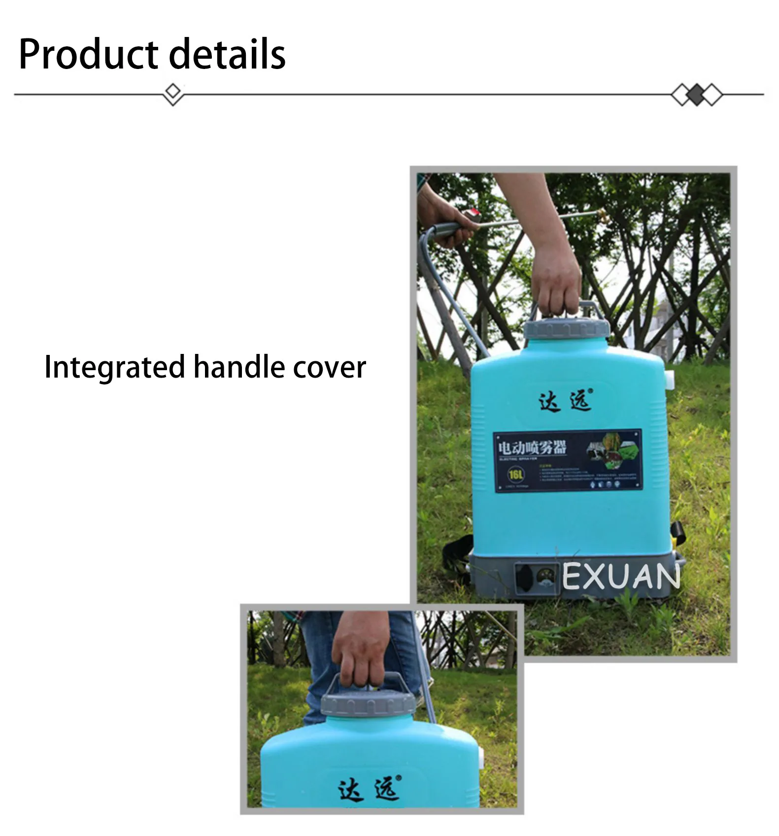 Practical models: Battery type:8AH lithium battery Life time:About 4-4.5 hours Pressure:0.2-0.4mpa Capacity:16L (about 32 kg) Upgrade section: Battery model:10AH lithium battery Life time:About 5-5.5 hours Pressure:0.2-0.4mpa Capacity:16L (about 32 kg)