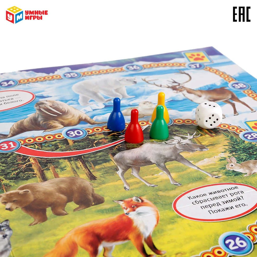 В комплекте: 4 фишки, кубик, 24 карточки и игровое поле с изображением различных зверей. В игре могут принять участие от 2 до 4 человек.
