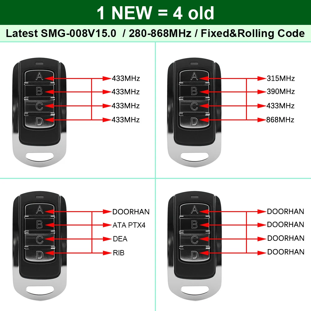 Learning frequency range: 300MHz ,303MHz,306MHz ,310MHz ,315MHz, 315.5MHz ,330MHz, 360MHz ,390MHz, 410MHz, 430.5MHz, 433.42MHz, 433.92MHz, 434.42MHz, 868.35MHz, 286-361MHz, 384-400MHz.