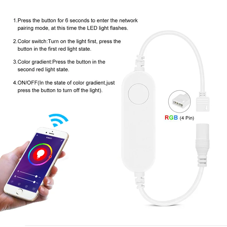 • Этот контроллер предназначен для светодиодный ленты, модуля и т. Д. После того, как легкая установка и настройки Вы сможете использовать телефон (с ОС IOS или Android) для управления светильник.