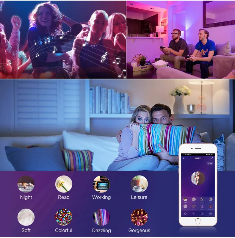 • Различные функции: 16 миллионов цветов/Управление смартфоном/Синхронизация с помощью группы/пользовательский режим/Режим таймера Kick-start ваши вечерние/светильник для танцев с музыкой/Сохранение любимых цветов/дистанционное управление через Интернет