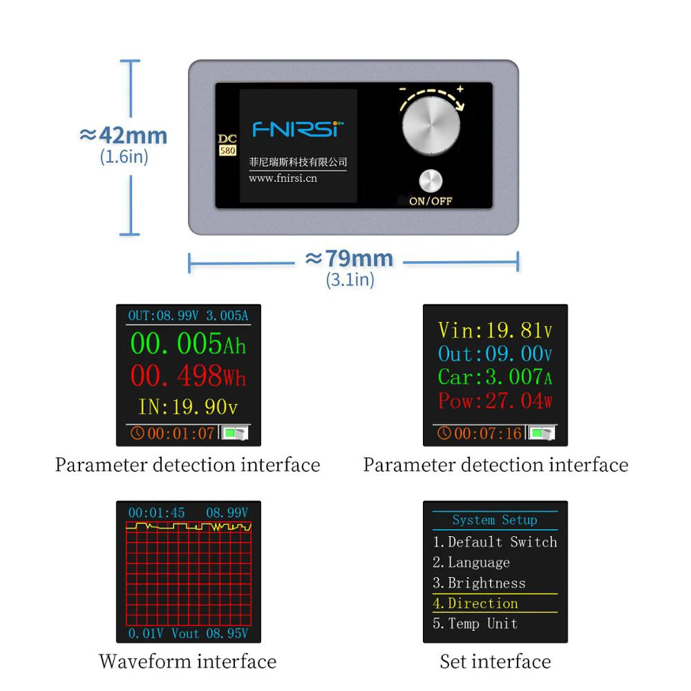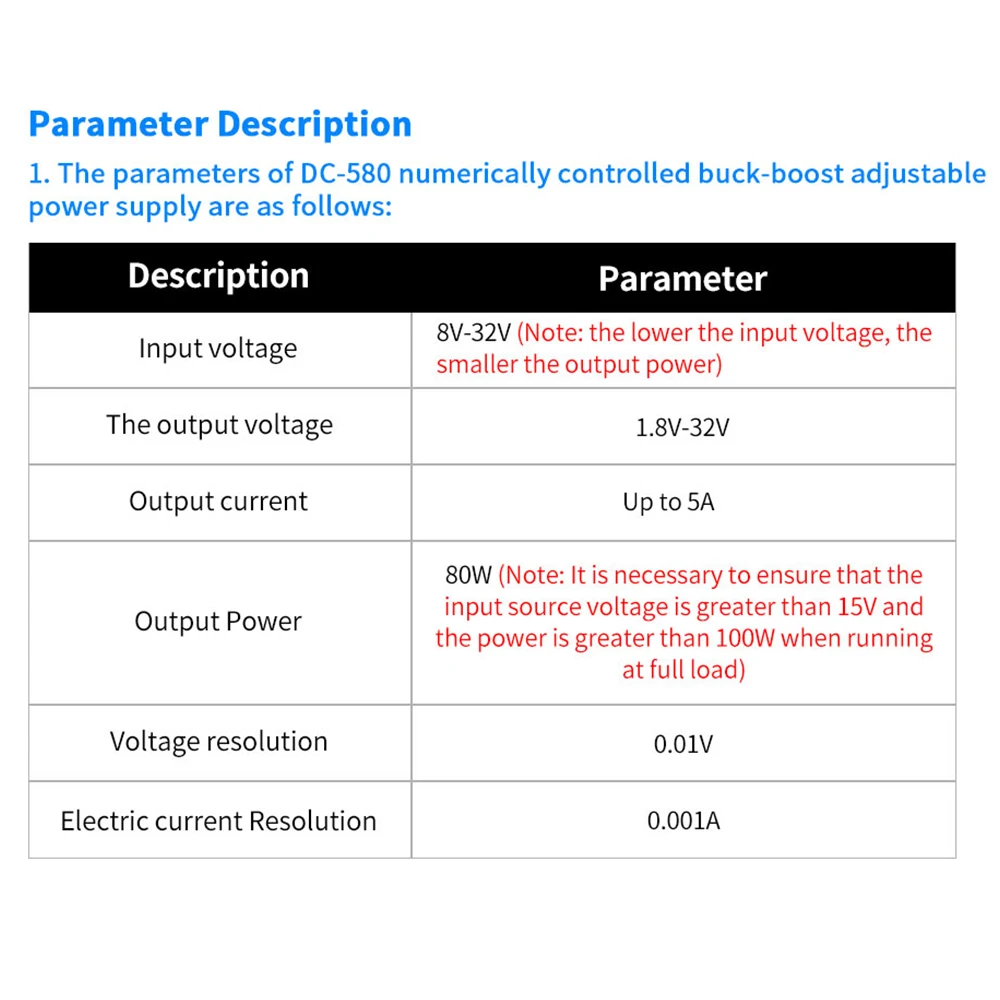 DC-580 NC повышающий и понижающий Регулируемый источник питания небольшой по размеру, мощный по функции, стабильный по производительности, высокая точность и имеет различные гуманизированные настройки системы. 1,44 дюймовый ЖК-дисплей высокой четкости, отображение различных данных на одном экране, страница является краткой и богатой.