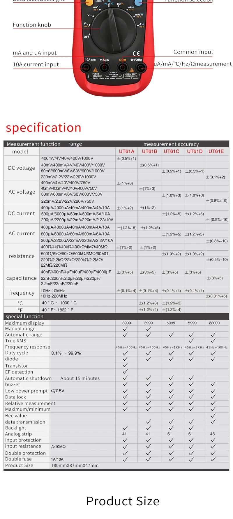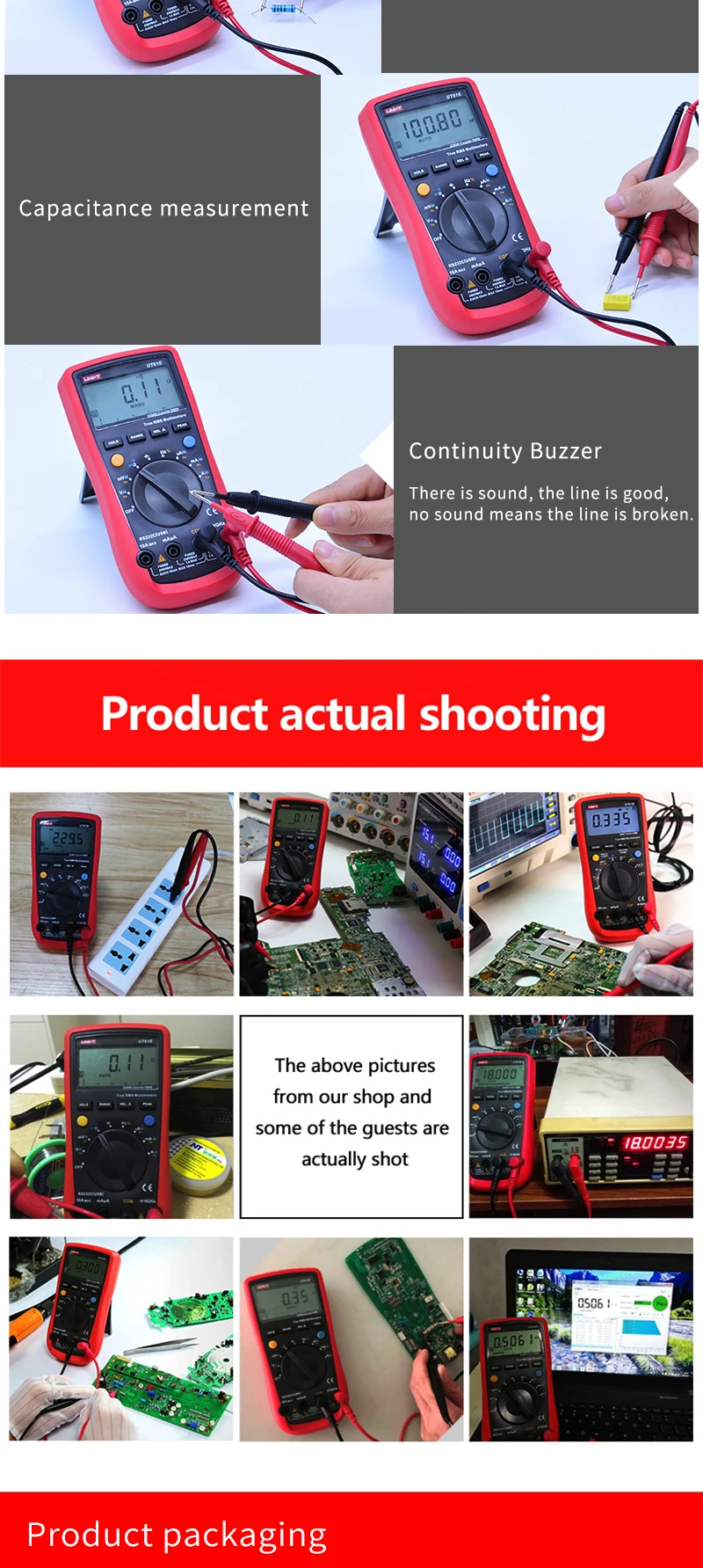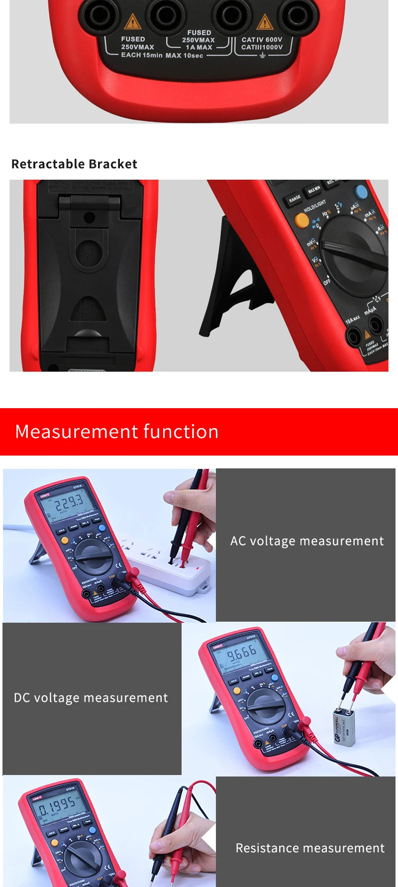 • Цифровой мультиметр UT61A/B/C/D/E UNI-T-1 шт. • Тестовые провода-1 шт. • 1 x RS-232C кабель (кроме UT61A) • Датчик температуры с точечным контактом типа K (только UT61B и UT61C)-1 шт. • Многоцелевой разъем UT61-1 шт. • Цветная коробка-1 шт.