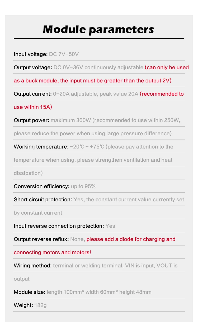 В частности, для тех, кто заряжает батареи, подключает двигатели и двигатели, не забудьте добавить диод к выходу модуля для предотвращения обратного потока. Без добавления диода модуль точно выгорит. Мы продаем диоды! Помните, помните!