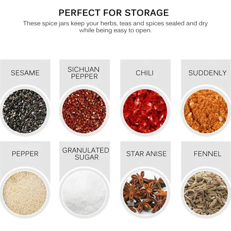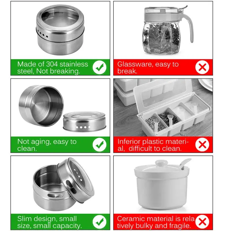 Конструкция из нержавеющей стали без ржавчины. Банки для специй изготовлены из нержавеющей стали 304, можно мыть без появления вредной ржавчины, прозрачный пластик-это новый ПЭТ-пластик, безопасный и экологически чистый.