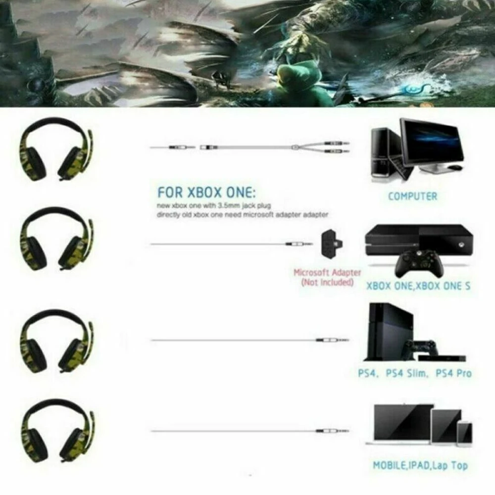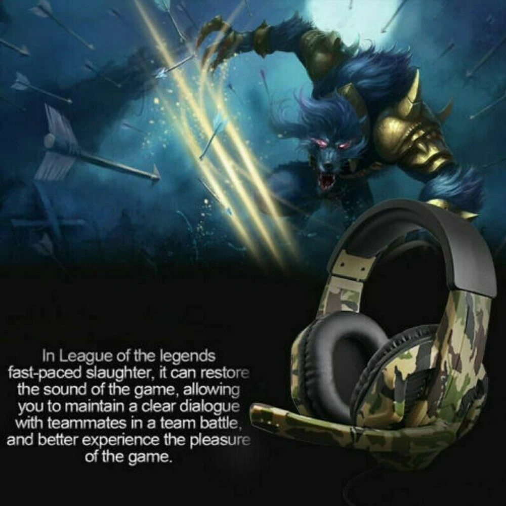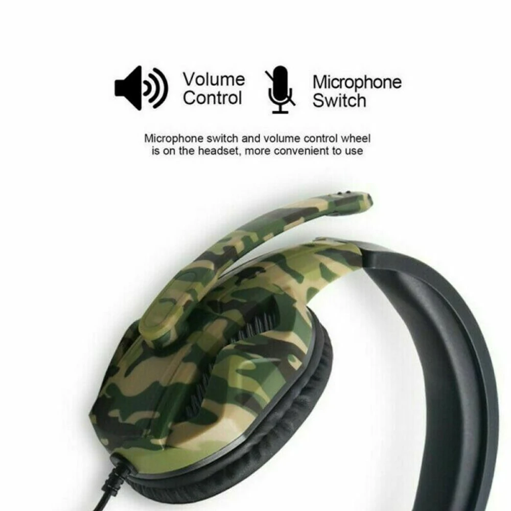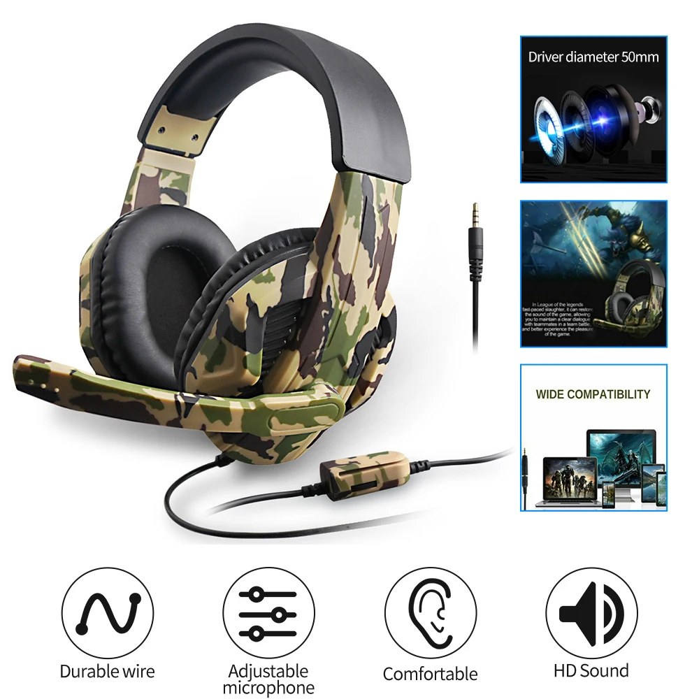 1. Разработан как Камуфляжный вид, чтобы принести вам другую и уникальную гарнитуру. 2. Благодаря 50 мм сабвуфер динамик звуковой катушки, магнитные тарелки динамик и воздухом резинового кольца, изготовленные на станке, он может обеспечить реалистичный звукового поля, ясность и шокированы звук. 3. Высокоэффективный голосовой всенаправленный емкостный Полярный микрофон 36 дБ, чтобы принести Вам высококачественный разговор. 4. Удобно носить, эргономичный дизайн с мягкими ПУ наушниками и легкая головная повязка. 5. Совместимость с мобильными телефонами, планшетами, компьютерами, mp4, для PS4 switch.