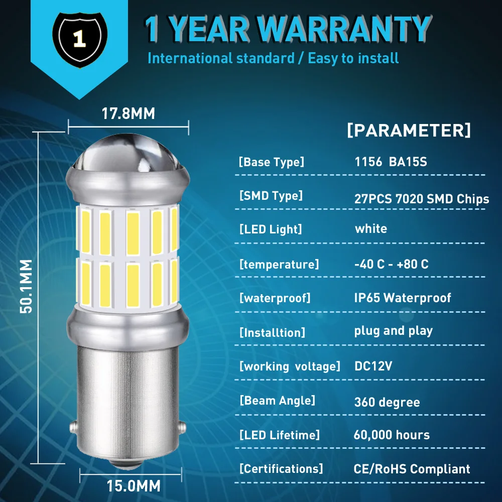 1. Напряжение: DC12V 2. Входная мощность: 12 Вт 3. Люмен: 2400lm 4. Светодиодный Тип: 27 шт. 7020SMD 5. Цвет: 6000K ксеноновый белый 6. Идеальная замена для старой галогенной лампы