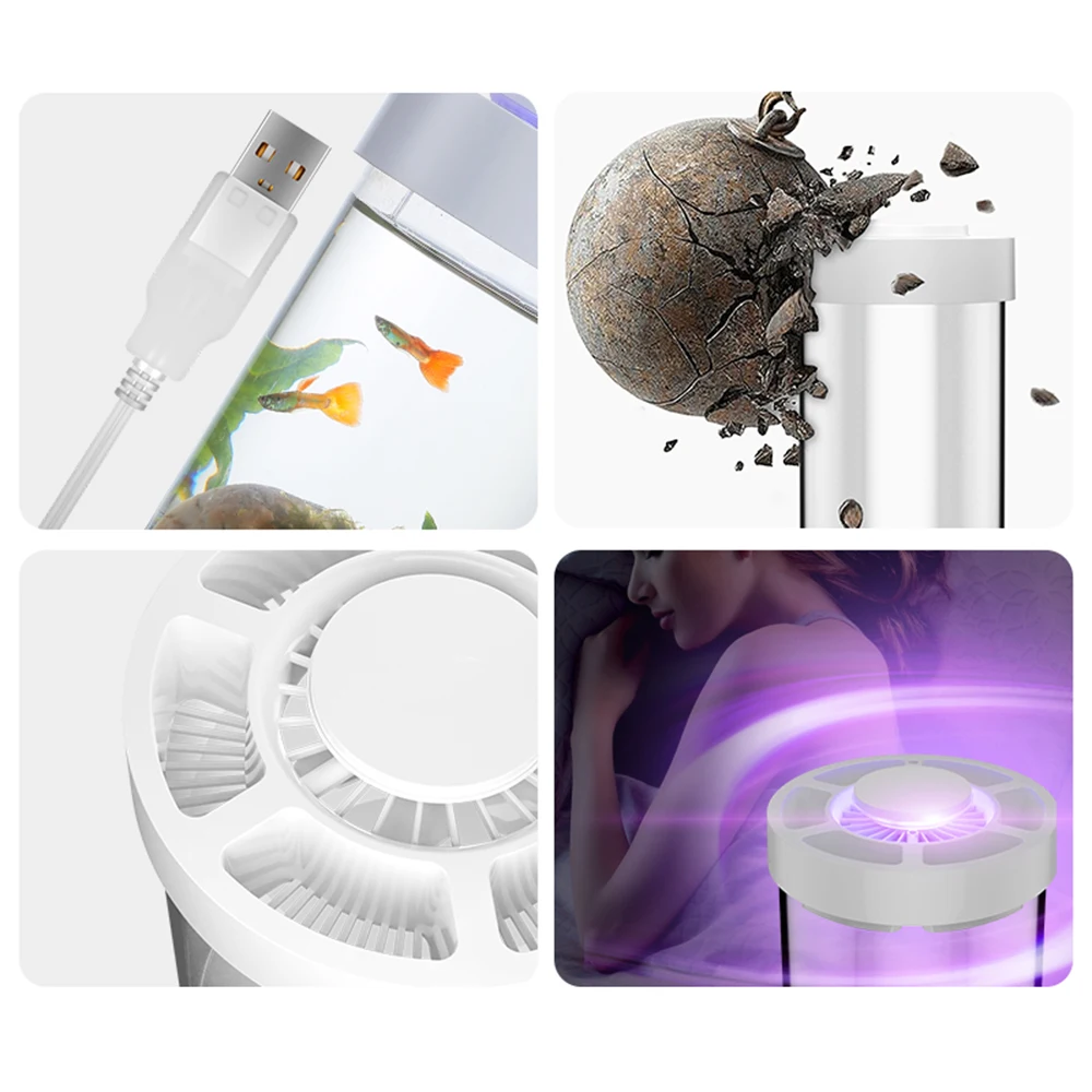Функция уничтожения комаров-Используя бионическую технологию, он использует ультрафиолетовый светильник для привлечения мух, вытягивает их в резервуар в качестве пищи рыбы воздушным потоком. И мощный двигатель обеспечивает стабильную и тихую работу, чтобы не беспокоить вас во время сна.