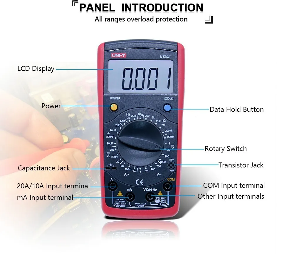 Цифровой мультиметр Серии UT39-это ручные инструменты с 2000 счетами, отличающиеся стабильной производительностью, универсальными функциями, высокой степенью надежности и точности. Они разработаны с крупномасштабными интегральными схемами, двойным интегральным преобразователем A/D, а также защитой от перегрузки. Серия может измерять напряжение переменного/постоянного тока, ток переменного/постоянного тока, сопротивление, емкость, частоту, температуру, Диод и непрерывность, что делает серию идеальным инструментом для пользователей.