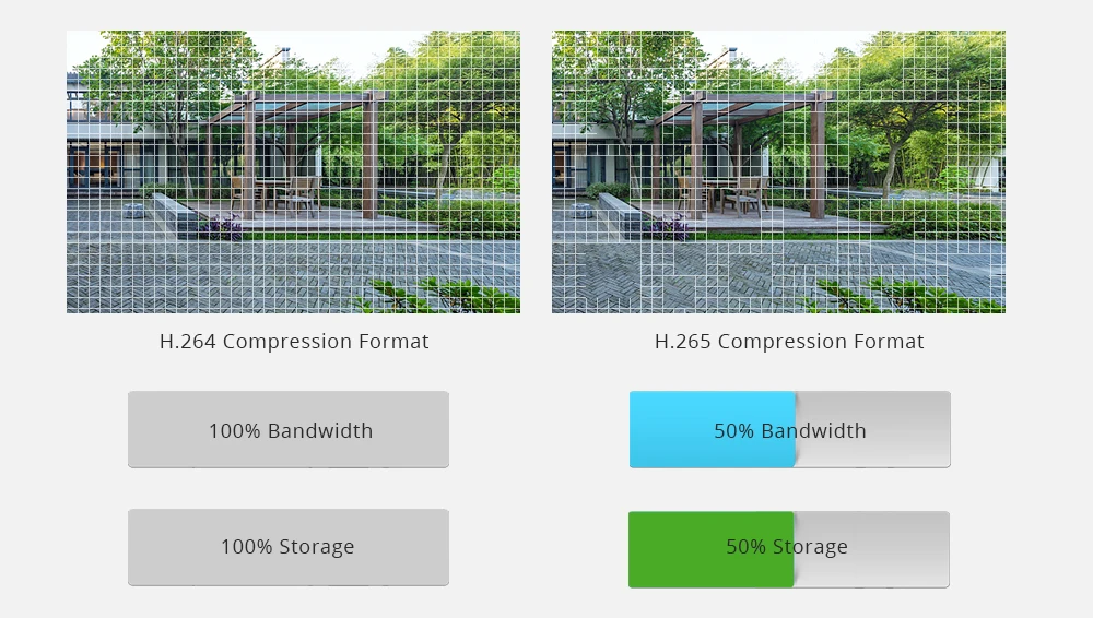 Стандарт кодирования H.265 позволяет записывать до 4 раз дольше, чем H.264 с тем же HDD. С той же пропускной способностью, он не только более четкий и плавный видео передает, но и экономит больше места на диске, таким образом, экономит большое количество денег для вас.