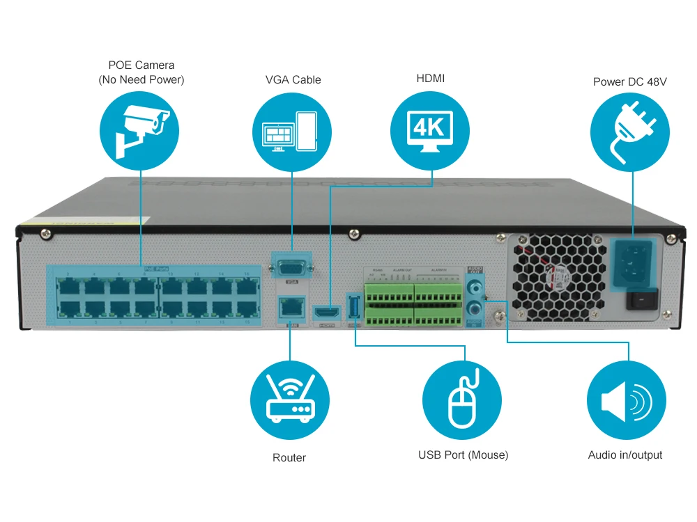 Этот NVR поддерживает макс. 32CH 8,0 мегапиксельный ip-видео вход и HDMI выход. Поддерживаемые Onvif, вы можете легко добавить любые другие вечерние ip-камеры в эти системы. (Если вам нужно подключение 32 камер. Нужен коммутатор POE)