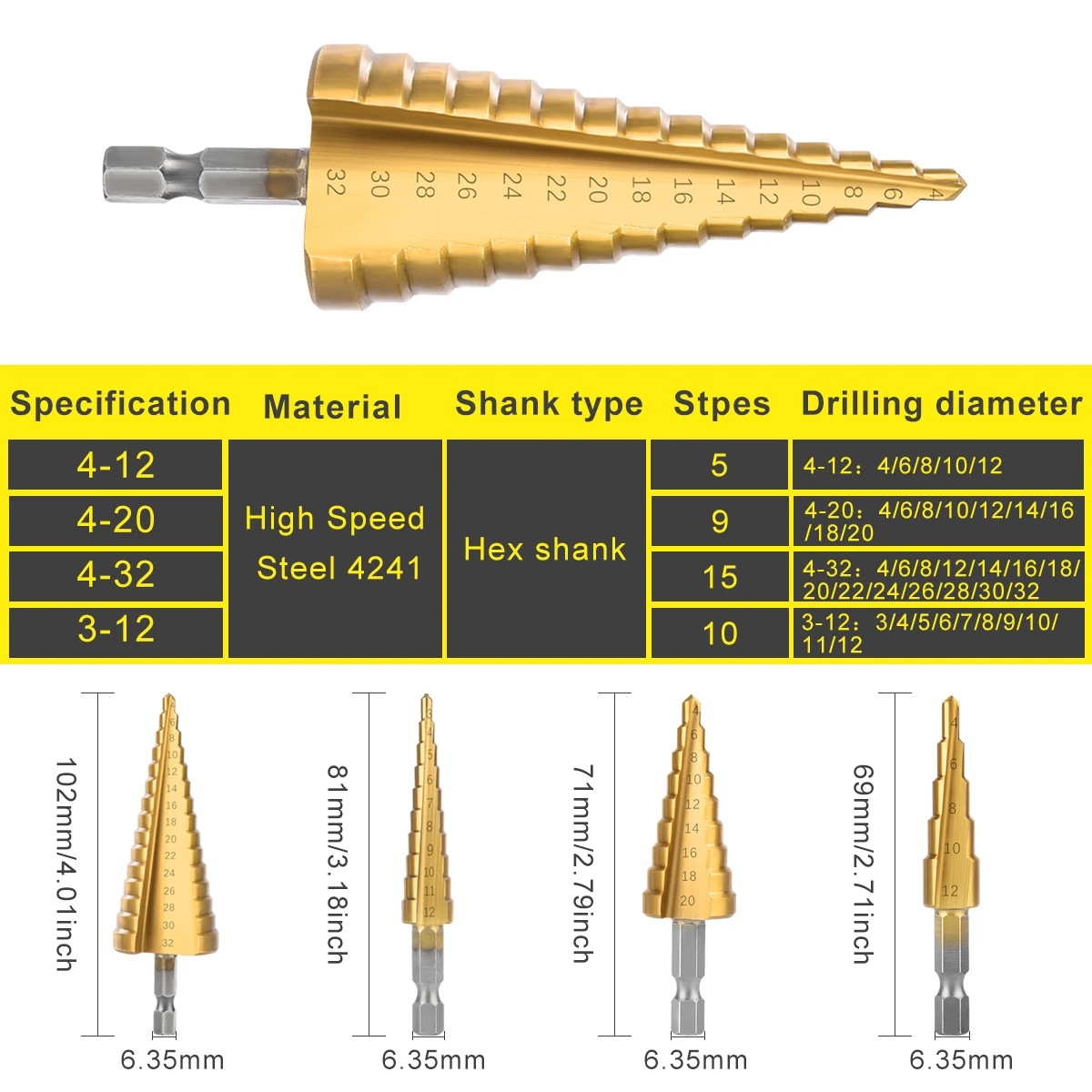 Особенности: 100% новый и высокое качество Изготовлен из высококачественной стали HSS Идеально подходит для использования для резки отверстий из различных материалов, включая латунь, дерево, пластик и т. д. 3 шт. набор сверл Hss, качественный инструмент для работы всех размеров Титановое покрытие для уменьшения мощности и тепла Термообработанная и полированная. Сверла Идеально Круглые отверстия в стали, латуни, пластика, дерева и т. Д. 6 сторонний дизайн shanks для предотвращения проскальзывания, когда в Чаке Дизайн с двумя флейтами быстрее, плавнее и чище режет каждый шаг четко маркируется с диаметром глубины в шаги Длина: 4-12 мм Длина: прибл. 6,5 см/2,56 дюйма 4-20 мм Длина: прибл. 7,7 см/3,0 дюйма 4-32 мм Длина: прибл. 10,0 см/3,94 дюйма 3 резца поставляются в следующих размерах: 4-32 мм:(4 мм, 6 мм, 8 мм, 10 мм, 12 мм, 14 мм, 16 мм, 18 мм, 20 мм, 22 мм, 24 мм, 26 мм, 28 мм, 30 мм, 32 мм) 15 шагов 4-20 мм :( 4 мм, 6 мм, 8 мм, 10 мм, 12 мм, 14 мм, 16 мм, 18 мм, 20 мм) 9 шагов 4-12 мм: (4 мм, 5 мм, 6 мм, 7 мм, 8 мм, 9 мм, 10 мм, 11 мм, 12 мм) 9 шагов Посылка включает: 1 набор сверл 4-12 мм 1 набор сверл 4-20 мм 1 набор сверл 4-32 мм 1х сумка