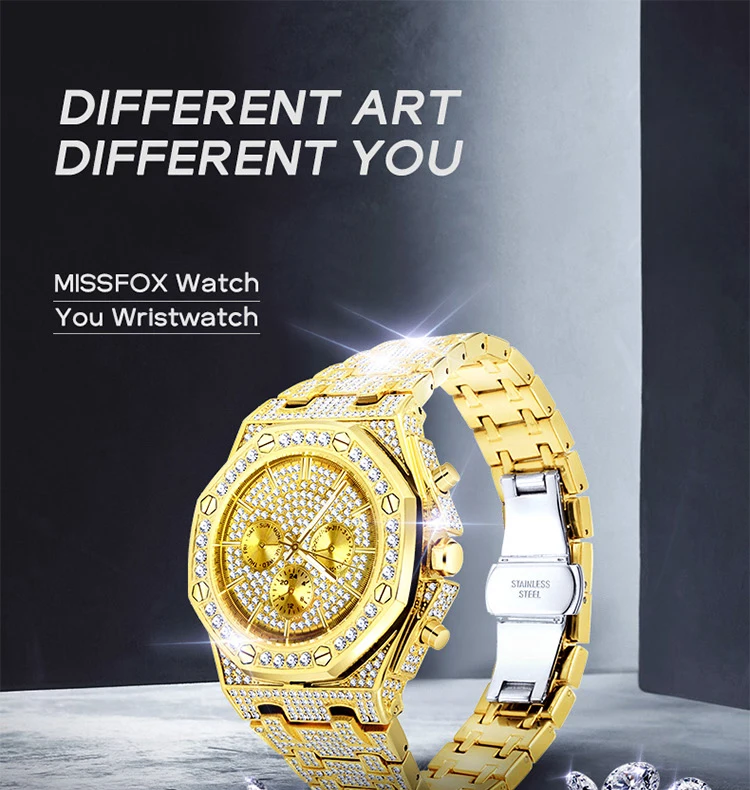 Описание: -Стиль: Роскошный -Функция Iced Out -100% новый и высокое качество. -Точный кварцевый механизм для точного сохранения времени. -30 м Водонепроницаемость (не для душа и плавания), ударопрочность, полный календарь -18K золото нано вакуумное покрытие, золотой цвет не выцветает. -Рождественский подарок, отжиг, вечерние, день рождения, одежда для свиданий