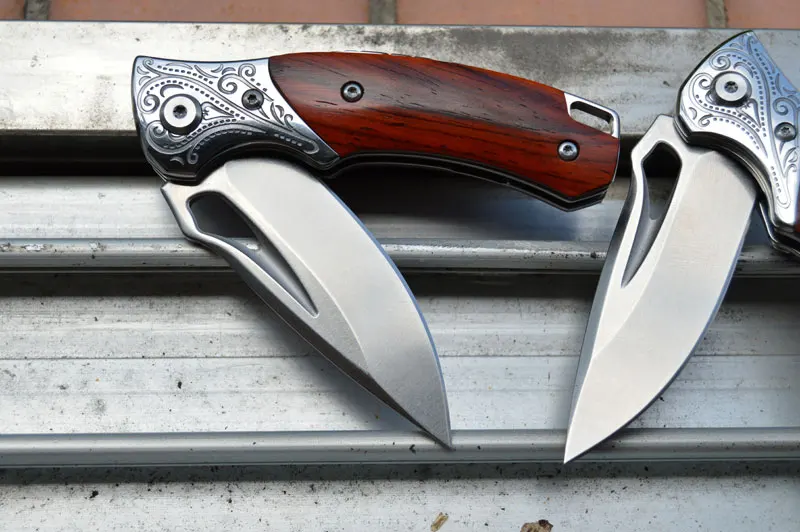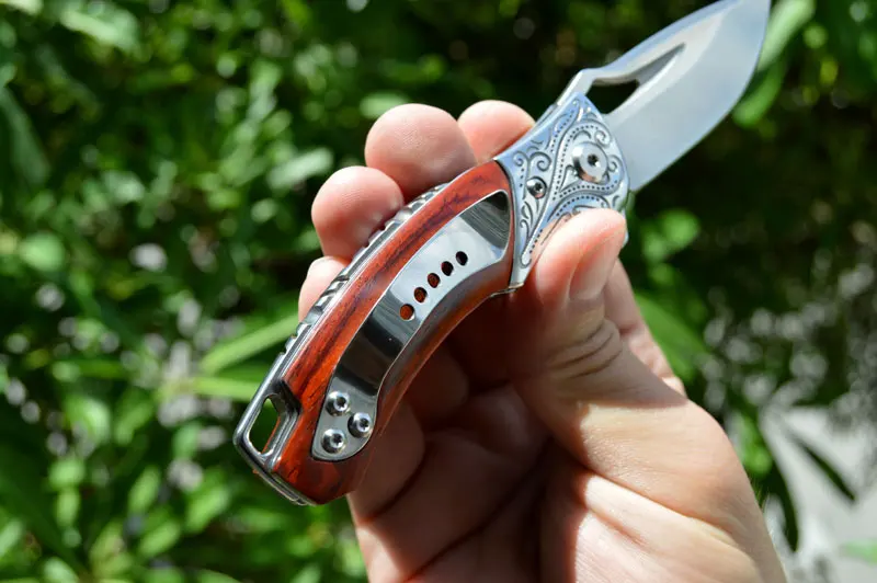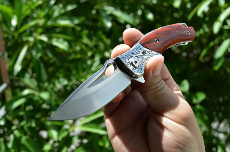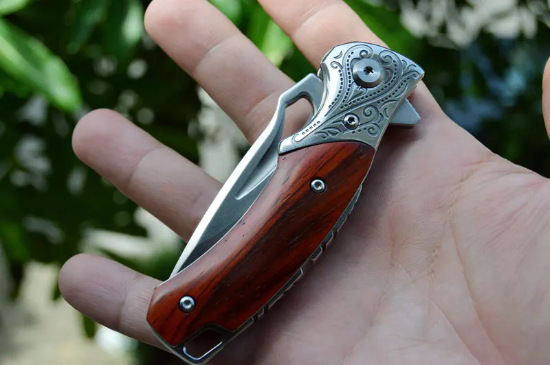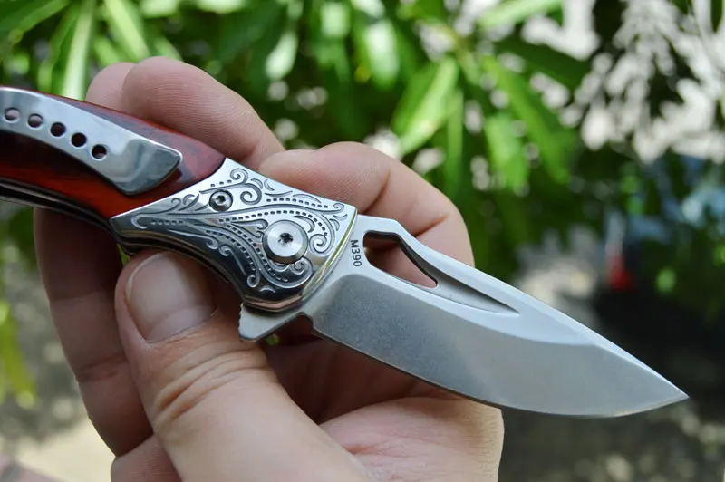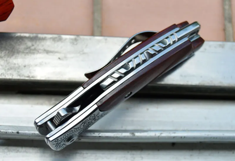 Шарнир керамического шарового подшипника для быстрого и быстрого раскрытия лезвия. Карманный зажим для удобной и безопасной переноски; Он имеет прочную желтую ручку из сандалового дерева, эргономично фрезерованную с длительной без усталости резкой в виду.